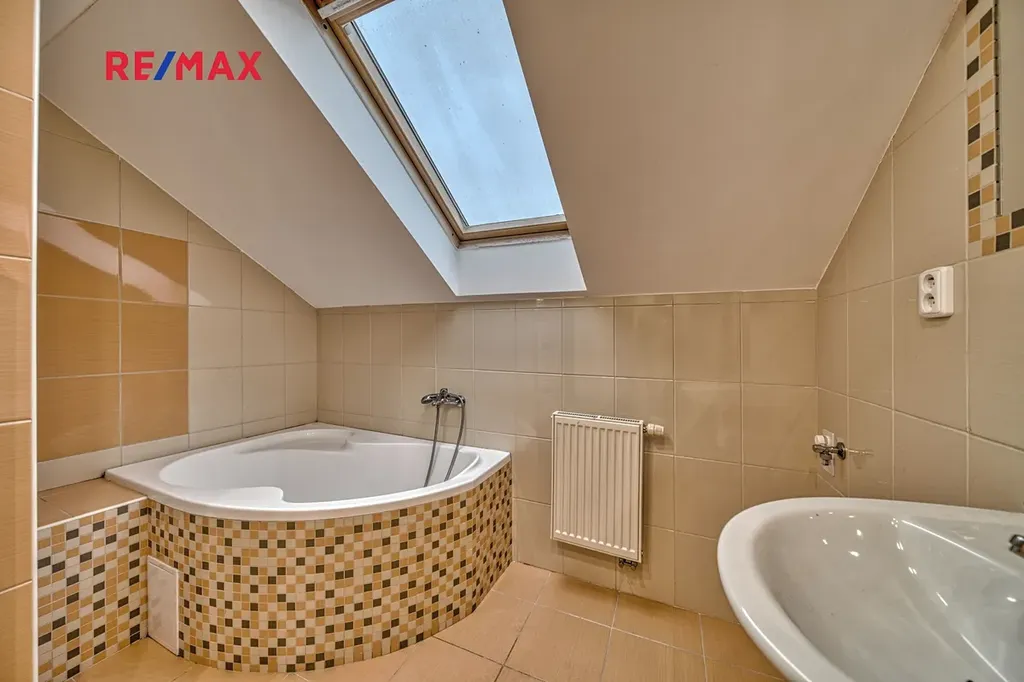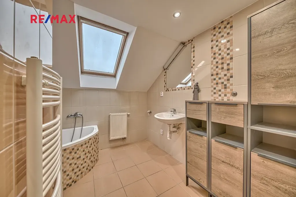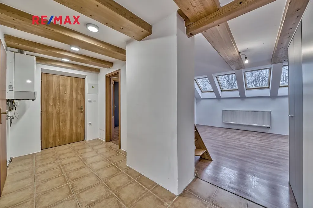 Vytápění bytu je zajištěno vlastním plynovým kotlem s rozvody do radiátorů. Na podlahách jsou plovoucí podlahy a dlažba. Střešní okna jsou dřevěná, v kuchyni plastová.