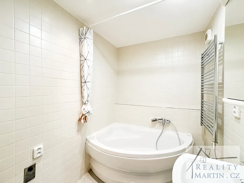 V koupelně rohová vana, topný žebřík a místo pro pračku/sušičku. WC geberit včetně bidetové sprchy a umývátka.