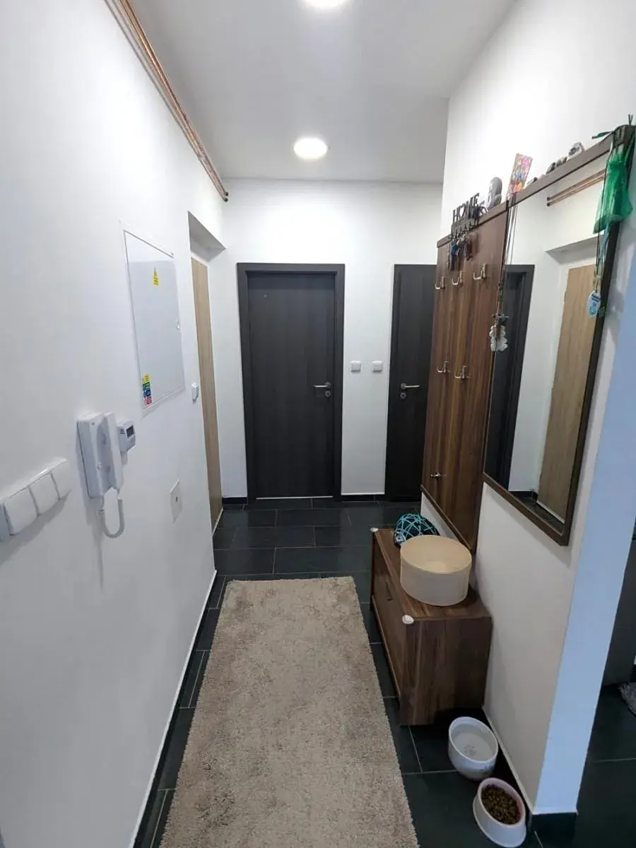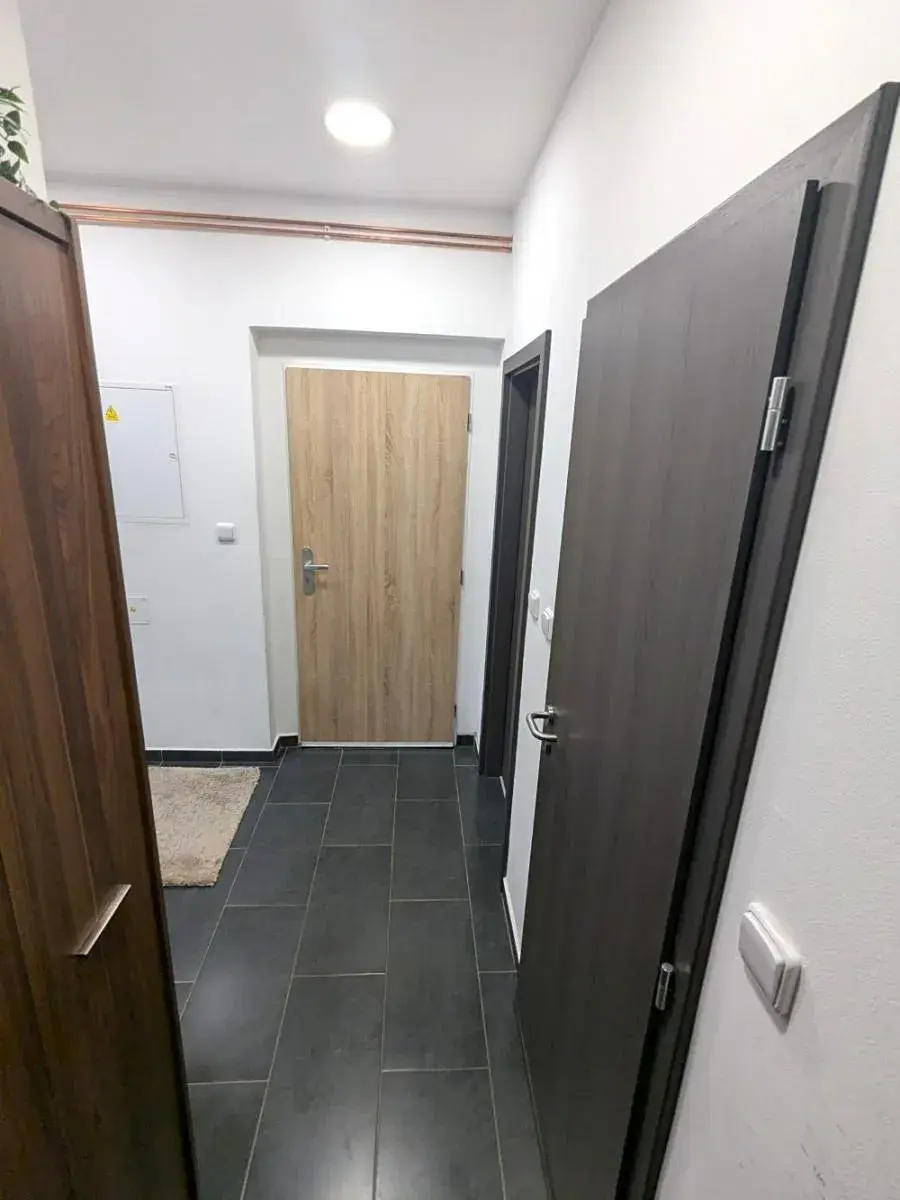 V kuchyni je linka s vestavěnými spotřebiči, prostorem pro lednici a přípojkou na myčku. Obývací část je velmi prostorná. Velkou výhodou jsou 2 toalety. Při vstupu do bytu je toaleta s umyvadlem a vedle v další místnosti je koupelna s WC, sprchovým koutem a 2 skříňky se 2 umyvadly. Z chodby je vstup do dalších 3 pokojů. Žádná z místností není průchozí, což je velká výhoda v rámci soukromí. Nově je v domě rozvedeno plynové topení.