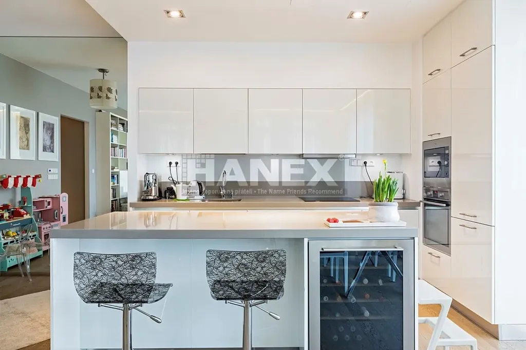 Moderní designový byt 3+kk (99 m2) s velkou privátní zahradou (200 m2), parkovacím stáním a sklepem v luxusní rezidenci v Praze 4 – Hodkovičkách. Nadstandardně vybavený a zařízený byt vás nadchne svou velkorysou dispozicí a vzdušností. Plně klimatizovaný byt nabízí 2 ložnice, prostornou šatnu – walk in closet, koupelnu s vanou, sprchový kout a toaletou a samostatnou toaletu. Z obývacího pokoje (40 m2) s kuchyňským koutem je přímý vstup do zahrady. Kuchyňská linka s ostrůvkem je vybavena kvalitními vestavěnými spotřebiči. Luxusní bydlení doplňuje krytá terasa s vířivkou. Předokenní žaluzie. Orientace bytu jih a východ.