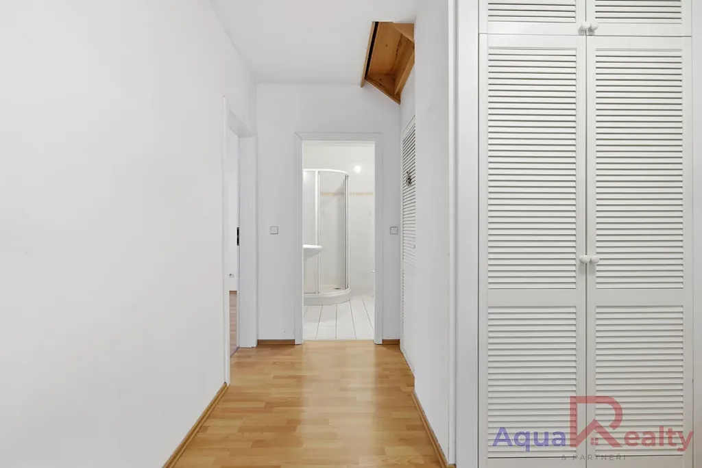 V patře jsou situovány dvě prostorné ložnice, které mají přístup na společný balkon orientovaný na jižní stranu, díky čemuž jsou pokoje světlé a prosvětlené po celý den. Jedna z ložnic má téměř 30 m a nabízí možnost rozdělení na dva samostatné pokoje, čímž lze obnovit původní projektovou dispozici 5+kk. Patro doplňuje koupelna s vanou a menší šatna.