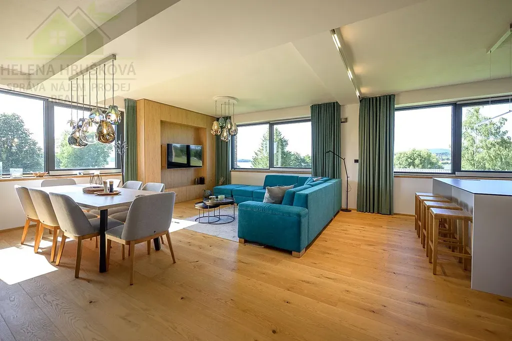 dovoluji si Vám exkluzivně zprostředkovat dlouhodobý nájem prostorného bytu 3 kk, 95 m2, na břehu Lipenské přehrady, u Molla Jestřábí, nacházející se v novostavbě bytového domu č.p. 209, Černá v Pošumaví. Přízemí nemovitosti tvoří sokromé wellness s bazénem a posilovnou určené pro rezidenty.