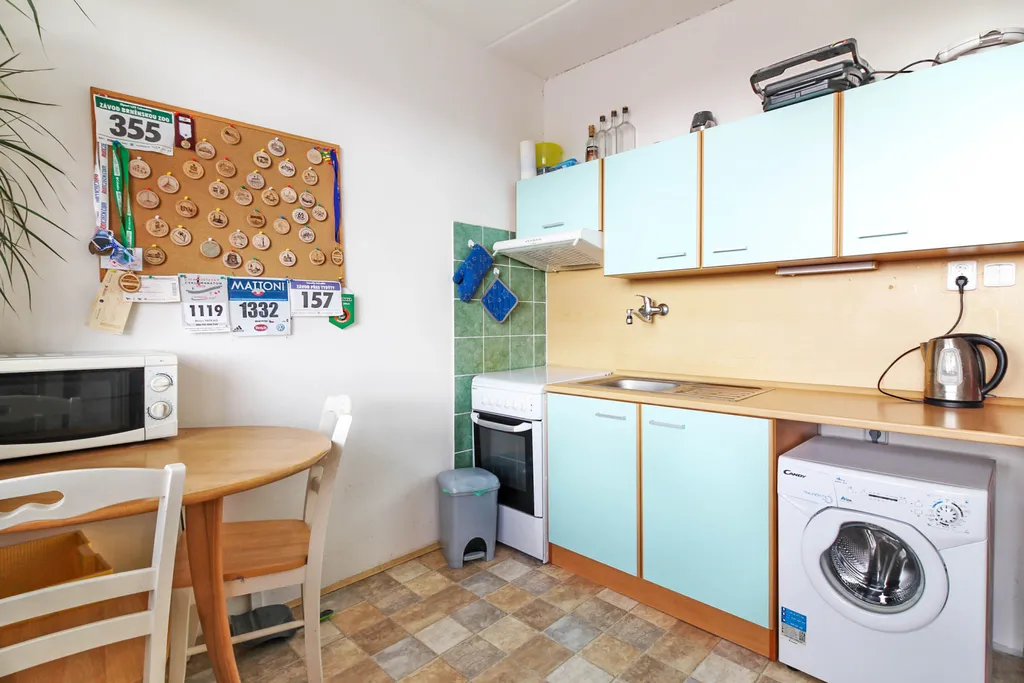 Byt se nabízí částečně vybavený. Kuchyňská linka disponuje lednicí, sporákem, digestoří, mikrovlnou troubou a pračkou. Dále je v kuchyni jídelní stůl se židlemi. Z kuchyně je také vstup na balkón. Ložnice je vybavena gaučem, postelí, šatní skříní a je zde vstup na druhý balkón. V koupelně se nachází umyvadlo se zrcadlem, sprchový kout a toaleta.