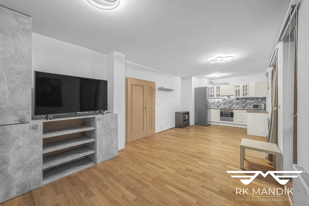 Byt se nabízí částečně zařízený dle prezentovaných fotografií. Součástí je plně vybavená kuchyňská linka s vestavnými spotřebiči, mezi které patří indukční varná deska, elektrická trouba, mikrovlnná trouba, digestoř s odvodem, myčka nádobí a volně stojící lednice. Obývací pokoj s přímým vstupem na prostornou terasu je vybaven obývací stěnou s televizí a je zde připravena možnost připojení k internetu.