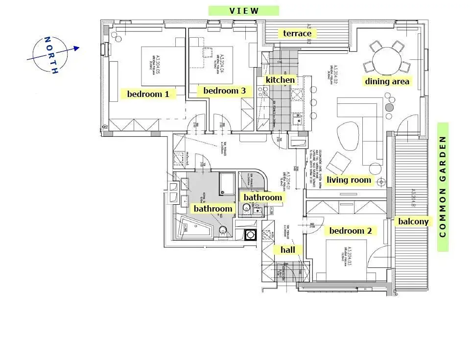 Interiér bytu je zařízený a dispozičně nabízí prostorný a světlý obývací pokoj spojený s moderní kuchyní a jídelním prostorem. Dále byt disponuje 3 ložnicemi, každá s vestavěnými skříněmi, dvěma koupelnami; jedná je vybavena vanou a sprchovým koutem, a druhá koupelna je vybavena sprchovým koutem. Součástí vybavení jsou: pračka a samostatná sušička, kabelové, SAT, telefonní a internetové připojení jsou též k dispozici. Byt je plně klimatizovaný, zařízen luxusním nábytkem, včetně na zakázku vyrobených postelí a skříní, na podlahách jsou parkety a dlažba. K bytu náleží sklep (4 m2) a k dispozici je i parkovací stání v podzemní garáži (za extra poplatek 5.000 Kč za místo).