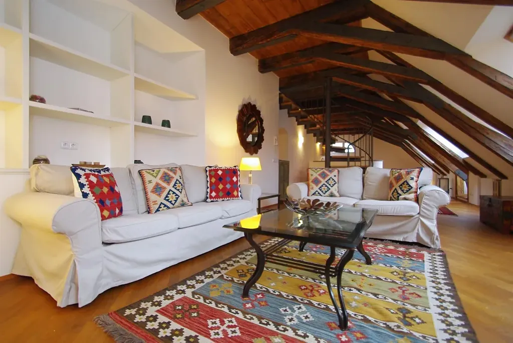 Reprezentativní podkrovní mezonet 4+kk ( 3 ložnice, 2 koupelny), o celkové obytné ploše 221m2, se nachází ve 2. a 3. patře dobře udržovaného domu s výtahem na Praze 1 Malá Strana, ulice Vlašská.