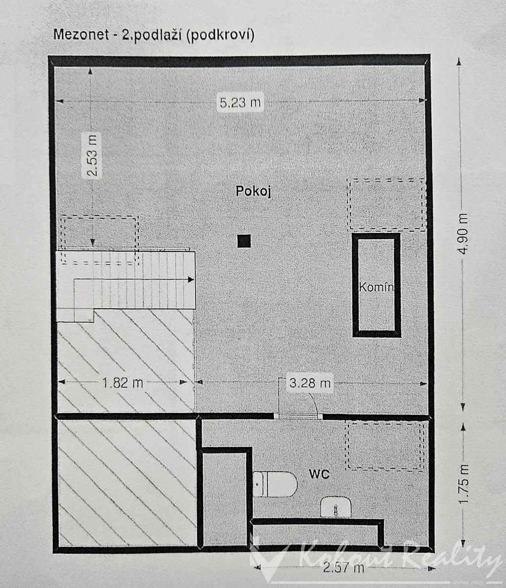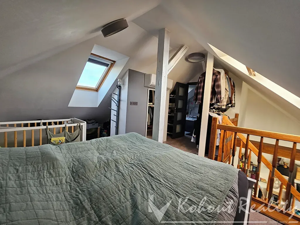 Byt je řešen jako mezonet. V přízemí se nachází prostorný obývací pokoj s masivní dubovou kuchyňskou linkou a lakovanou bukovou pracovní deskou, indukčním sporákem dále jídelní část, hala, samostatné WC a koupelna.Součástí přízemí je také otevřený pokoj s přímým vstupem na terasu, z něhož vede dřevěné schodiště do horního patra. Tento pokoj lze uzavřít posuvnou příčkou, dekoračním závěsem a využít ho například jako pracovnu, studovnu nebo rohový pokoj pro návštěvy (přiloženo více fotografií z různých úhlů pro Vaší představu). V 1. patře se nachází ložnice, koupelna s WC a velké množství úložných prostor. Byt má dvě koupelny, nové rozvody vody a odpadů, vodní podlahové topení, vinylové podlahy, klimatizaci s rekuperací a výměníkem.