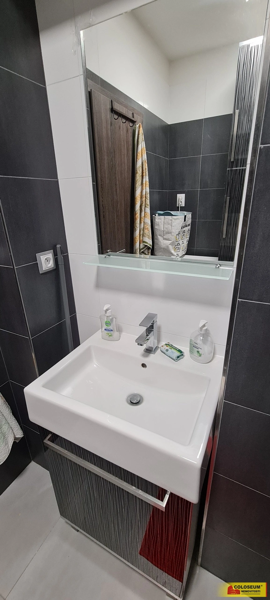 Koupelna je řešena ve vysokém standardu a působí velmi luxusním dojmem. Najdete zde prostorný sprchový kout 100×100 cm s termostatickou sprchovou baterií Grohe a tropickým deštěm, bezspárový velkoformátový obklad 3×1 m, designové umyvadlo CUBE se skříňkou a značkovou umyvadlovou baterii Grohe. Samozřejmostí je koupelnové zrcadlo s fazetou a bezdotykovým LED osvětlením, luxusní WC keramika Grohe, vysoká koupelnová skříňka, skleněné poličky a automatická pračka.