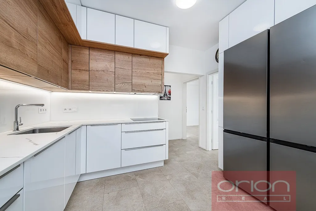 Byt byl zrekonstruován, součástí prodeje je moderní kuchyňská linka na míru se dvěma lednicemi a dalšími spotřebiči nejvyšší třídy zn. AEG, vestavěné skříně, úložné prostory vyrobené na míru, pračka a sušička, které jsou umístěné v technické místnosti, kde je také vestavěný nábytek včetně výlevky. Podlahy jsou vinylové. Vytápění a ohřev teplé vody zajišťuje společná kotelna v domě.