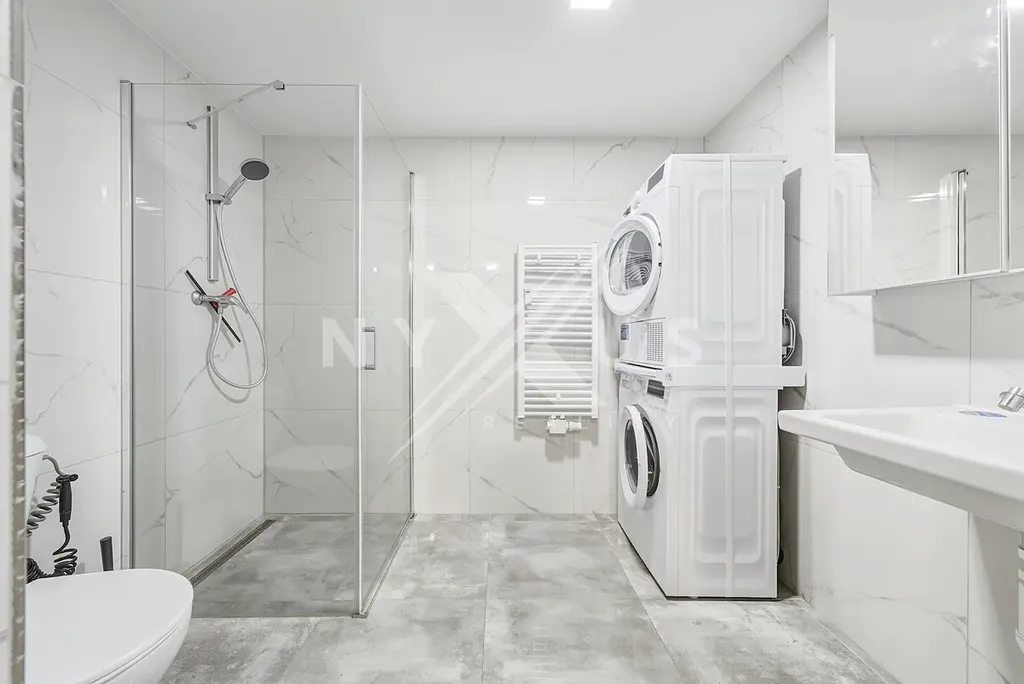 Vybavení (postel, pohovka, kuchyňská linka) součástí prodeje - používáno cca 1 rok. Nové spotřebiče - pračka se sušičkou, trouba, indukční varná deska, myčka na nádobí. Internet - vysokorychlostní připojení (400 Mb/s download i upload).