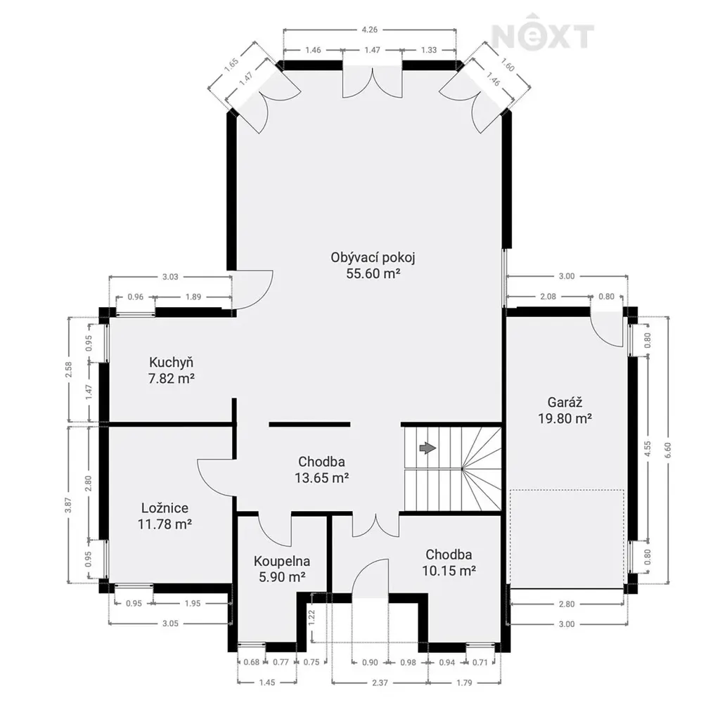 Přízemí domu je věnováno každodennímu životu. Přes kryté závětří vstoupíte do předsíně, odkud je přístup do koupelny. Navazuje prostorná hala se schodištěm, která propojuje jednotlivé části domu. Najdete zde pokoj pro hosty, komoru, kuchyni a velkorysý obývací pokoj. Ten nabízí dostatek prostoru pro rodinný život, společné večeře i lenošení na pohovce – přesně ten typ místnosti, kde se přirozeně schází celá domácnost.