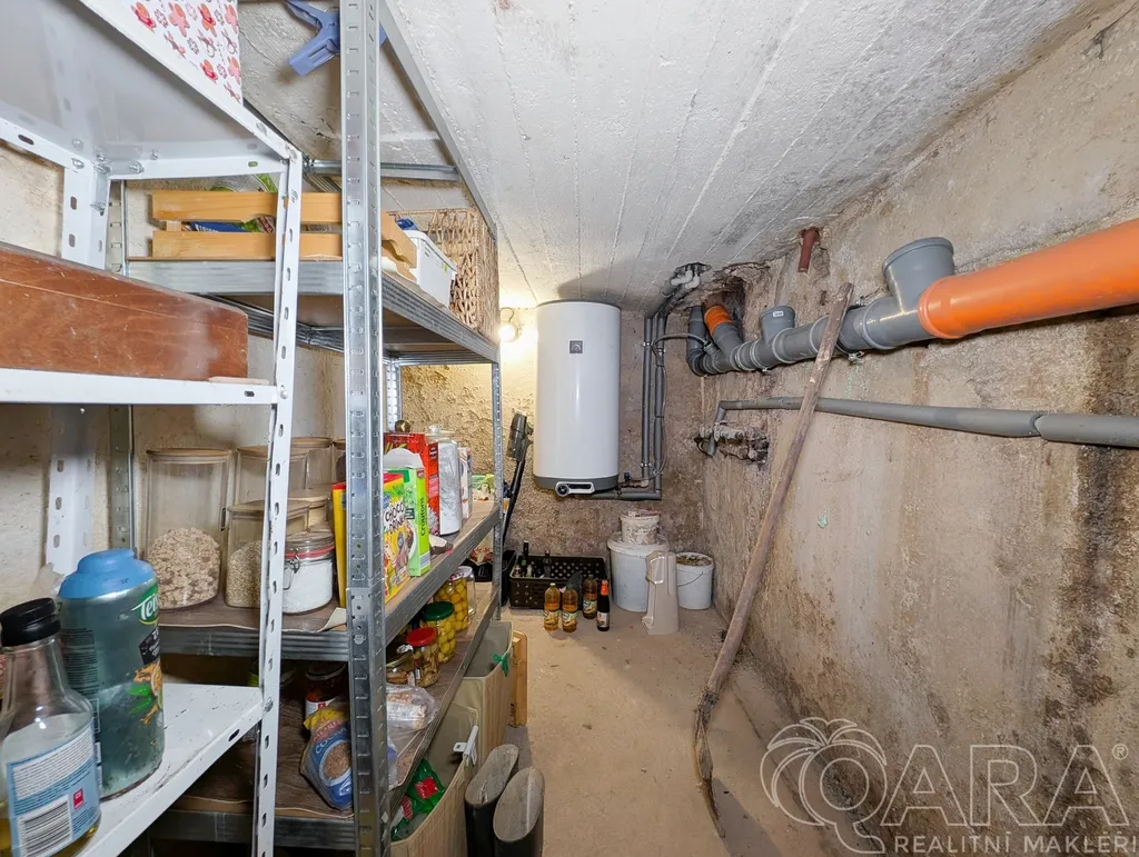 V přízemí (1. NP) o celkové výměře 68 m² se nachází bytová jednotka o dispozici 2+1, která zahrnuje koupelnu vybavenou vanou a pračkou. Toaleta je umístěna samostatně. Dům je rovněž částečně podsklepený, přičemž sklep má výměru 8,3 m². Vytápění je řešeno krbem s rozvodem tepla do radiátorů a termostatem, což zajišťuje příjemné teplo v celém domě.