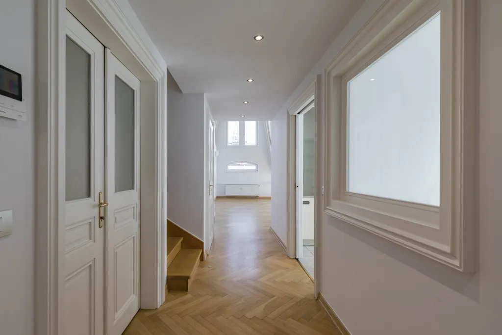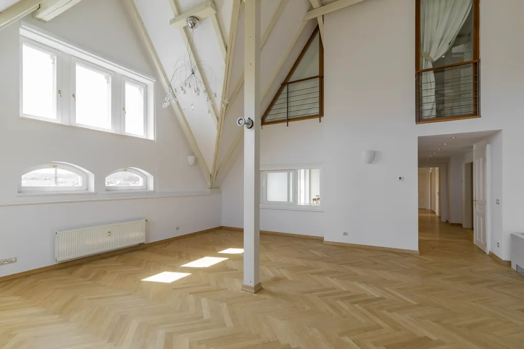 Nabízíme k pronájmu reprezentativní mezonetový byt 5+1 s terasou v 5. a 6. patře renovovaného neorenesančního činžovního domu s výtahem ve vyhledávané lokalitě Prahy 5 na rozhraní Malé Strany a Smíchova. Byt má celkovou plochu 286 m² a nabízí ve spodním patře vstupní předsíň, prostorný obývací pokoj, plně vybavenou kuchyň se spotřebiči (sklokeramická varná deska, trouba, lednice, myčka a mikrovlnná trouba), 1 ložnici s vlastní koupelnou s vanou, sprchou, toaletou a bidetem, šatnou a vstupem na balkon. Další dvě ložnice, obě se vstupem na balkon, 1 koupelnu s vanou, toaletou a bidetem, malou šatnu a komoru. V horním patře je otevřená místnost s možností využití jako ložnice pro hosty nebo herna pro děti, 1 koupelna se sprchou, toaletou a bidetem, prádelna s pračkou a sušičkou a terasa o velikosti 35 m² s pergolou, posezením s dechberoucím výhledem na Petřín a Pražský hrad. Byt je částečně zařízený a k jeho vybavení patří jídelní stůl a židle, postel a vestavěná skříň v ložnici, vybavená šatna, závěsy, regály v koupelně, klimatizace, alarm, videotelefon, bezpečnostní dveře, dřevěné parkety, mramorové podlahy v koupelnách, plynové topení. Na terase je venkovní nábytek a pergola, k rostlinám na terase je zaveden i systém zavlažování. V domě je denní recepce a možnost využít služeb údržbáře. K bytu náleží sklep. Perfektní poloha naproti Petřínským sadům, v docházkové vzdálenosti od Pražského hradu, Karlova mostu, Malostranského náměstí. V okolí domu je veškerá občanská vybavenost : restaurace, kavárny, bistra, obchody, zdravotnická zařízení. Jen pár kroků od Francouzského lycea, stanice tramvaje, metra Anděl a nákupního centra Nový Smíchov. Autem blízký nájezd na Pražský okruh a dálniční síť. Parkovací místo v garážích na zakladači vhodné pro nízká auta s výškou do 150 cm přímo v domě za extra poplatek 3.900 Kč + DPH/měsíc. Pro větší vozy je možné využít parkování v Drtinově ulici za extra poplatek. K bytu patří sklep. K dispozici ihned. Nájemce bytu má možnost stát se za poplatek členem wellness klubu Elliptico v rezidenci Ellipsis v Holečkově ulici.
