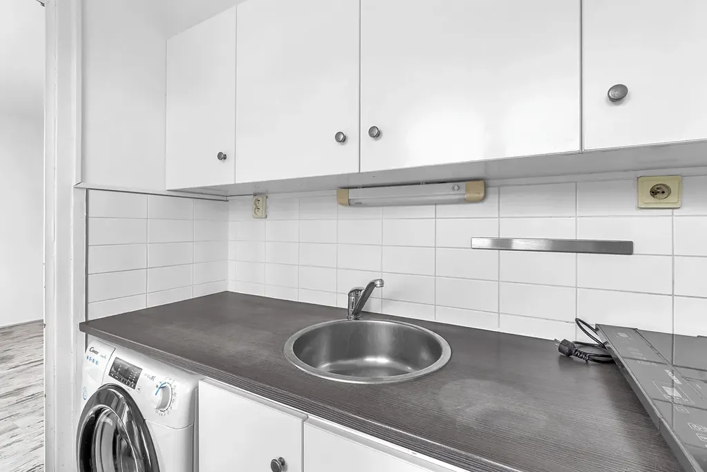 Vybavená kuchyně: Linka s indukčním vařičem a ledničkou.