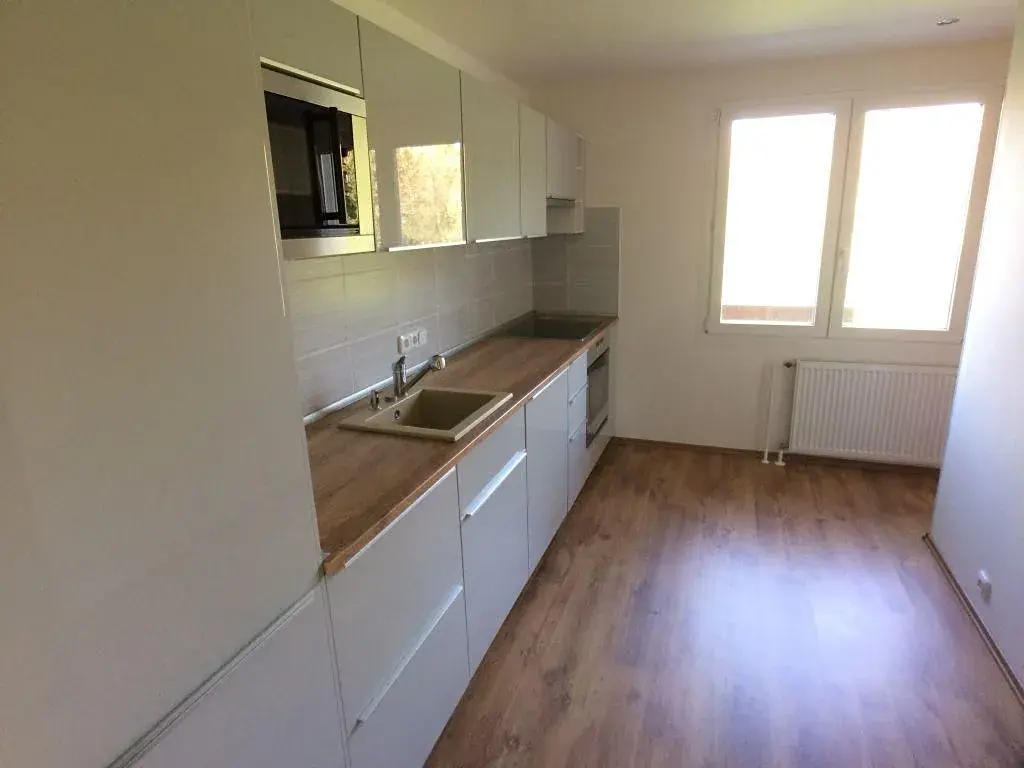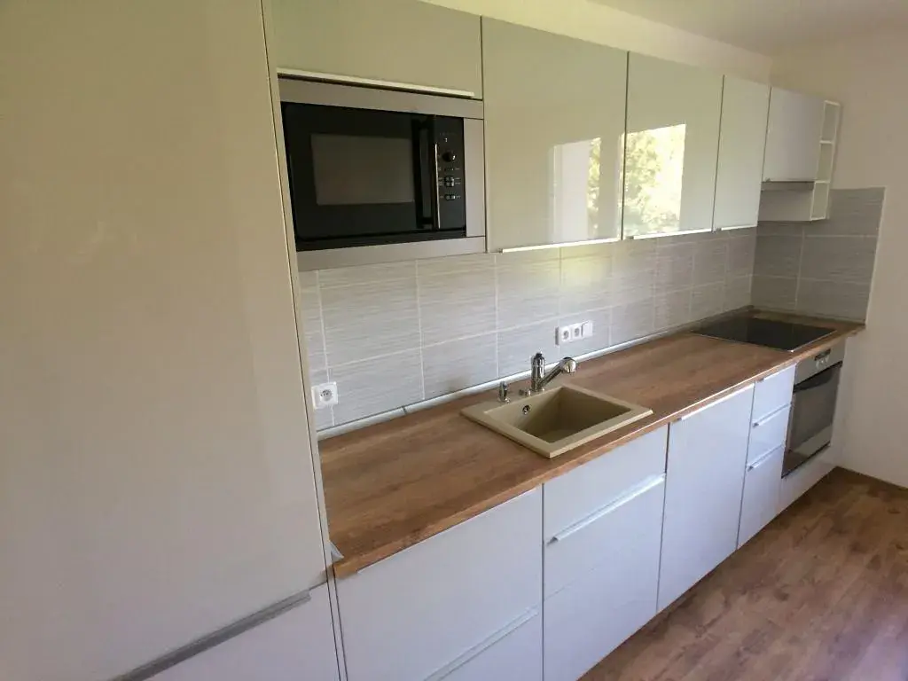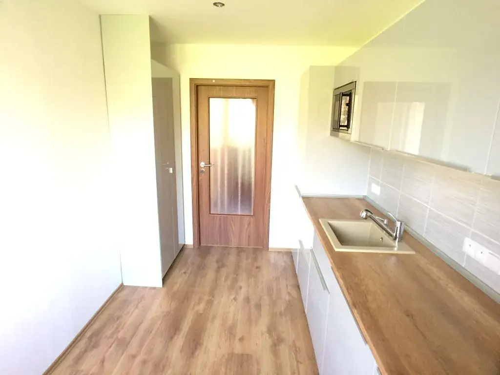 v patře vstupní hala se zádveřím, prostorný obývací pokoj, samostatná plně vybavená kuchyň, lednice, myčka, varná deska a trouba, dále toaleta a místnost na pračku,