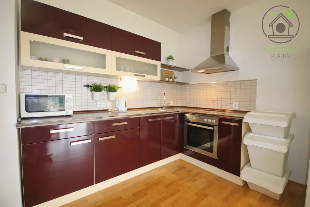 Srdcem bytu je prostorný a světlý obývací pokoj (35,81 m²) s moderním kuchyňským koutem. Kuchyňská linka je plně osazena kvalitními spotřebiči včetně sklokeramické desky a elektrické trouby, takže se zde můžete ihned pustit do vaření.