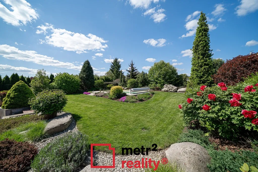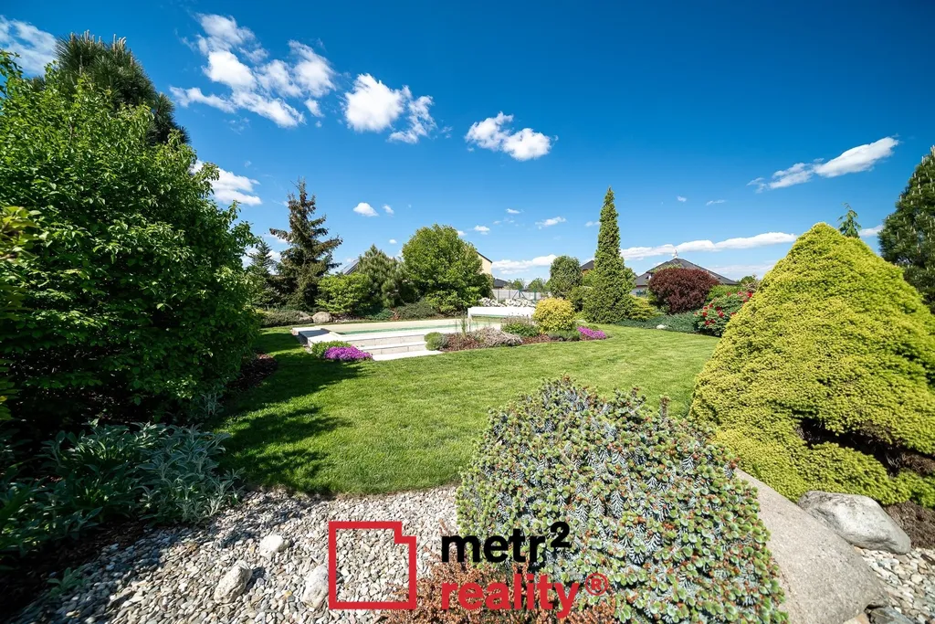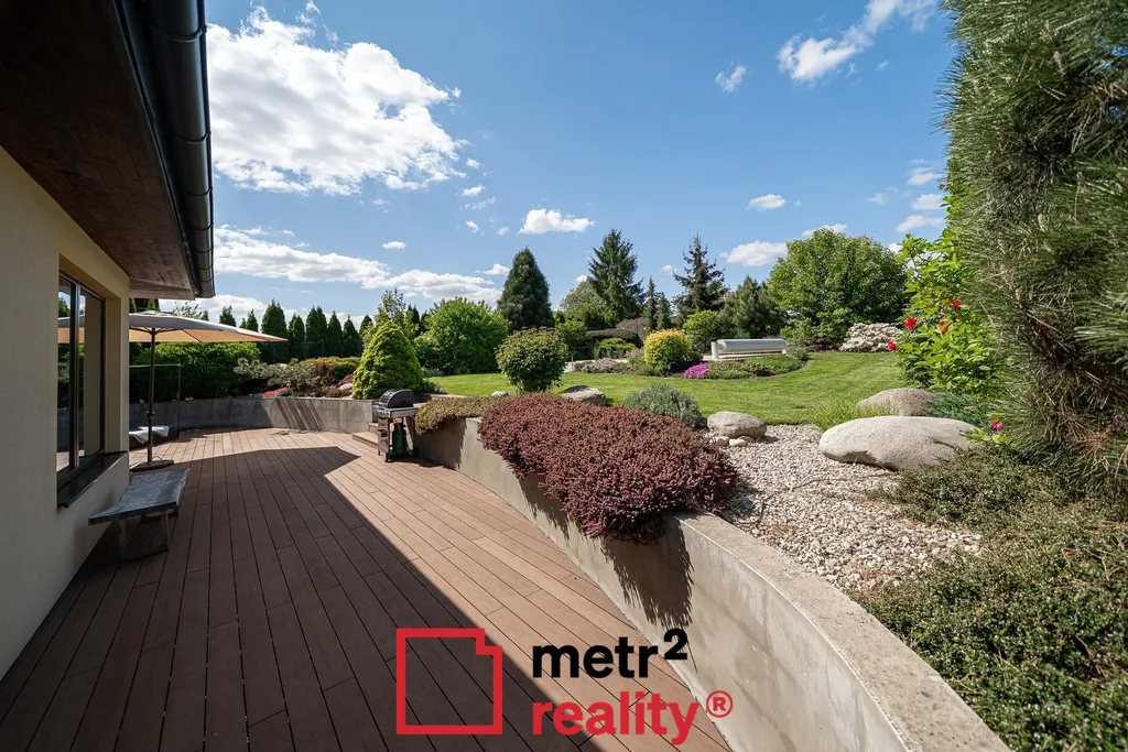 Dominantou nemovitosti je pečlivě udržovaná, vzrostlá okrasná zahrada s vyhřívaným keramickým bazénem (6,5 × 3,8 x 1,5 m, slaná voda, zakrytí roletou) a prostornou terasou ideální pro relaxaci. Na pozemku i před ním dostatek parkovací plochy, jedno kryté parkovací stání (přístřešek před vstupem do domu 15,93 m2).
