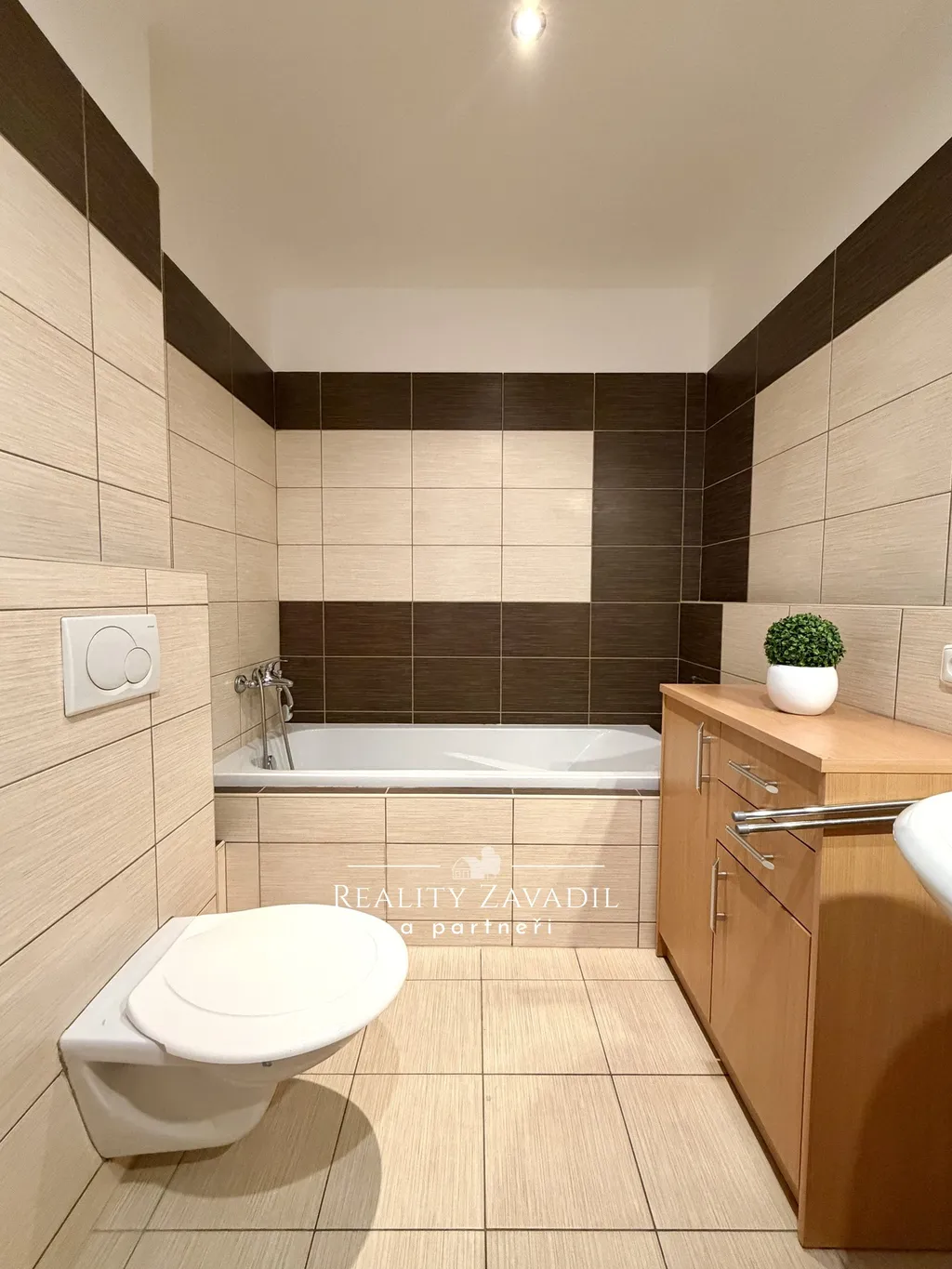 Samotný byt je ve velmi dobrém stavu a vyznačuje se účelnou dispozicí. Centrální část tvoří vstupní chodba, která propojuje jednotlivé místnosti. Zděná koupelna je obložena keramickým obkladem a vybavena vanou, toaletou, umyvadlem se skříňkou, zrcadlem a automatickou pračkou.