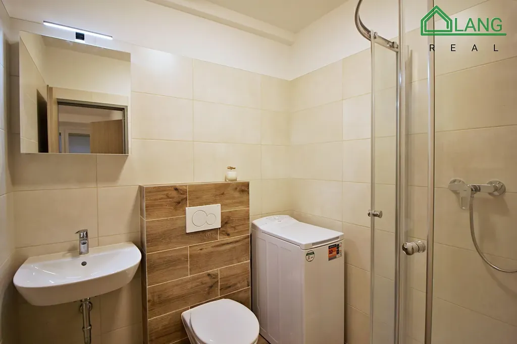 Nová koupelna se sprchovým koutem s WC a pračkou překvapí svoji velikostí.