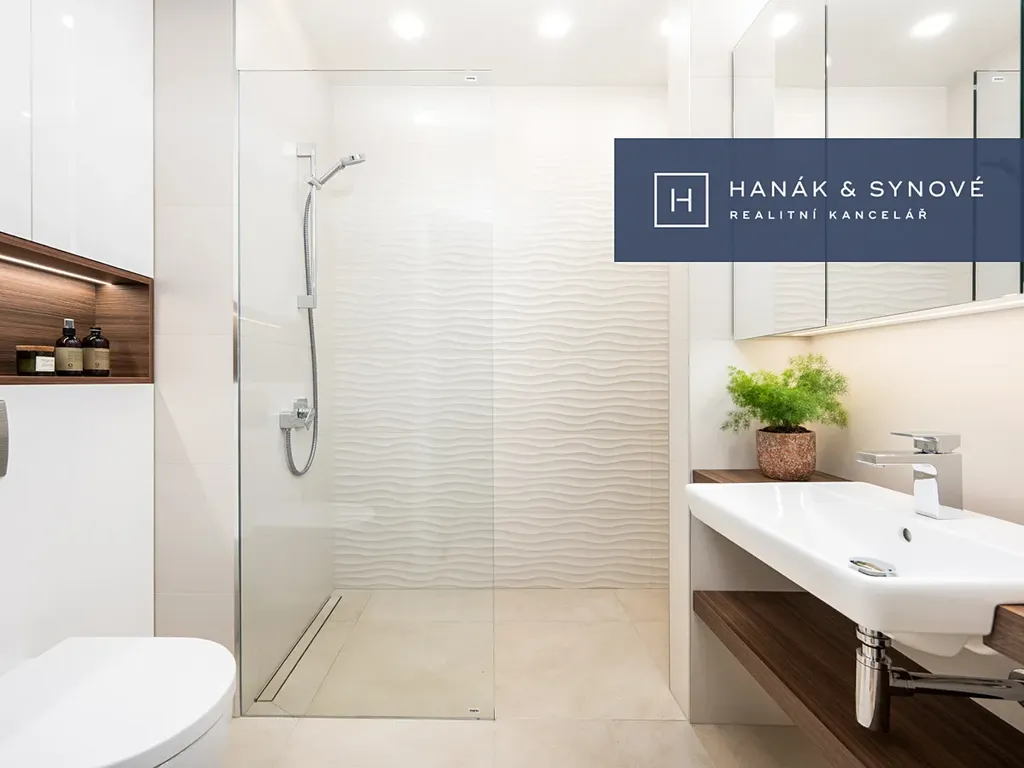 Byt je zařízený ve vysokém standardu a je nabízen plně zařízený – kuchyňská linka se spotřebiči (varná deska, trouba, vestavěná lednice s mrazákem, pračka se sušičkou), vestavěná skříň, postel, židle, pracovní stůl, venkovní žaluzie. Koupelna je vybavena walk-in sprchovým koutem se skleněnou zástěnou značky HÜPPE, záchodem a umyvadlem s umyvadlovou skříňkou, podsvíceným zrcadlem.