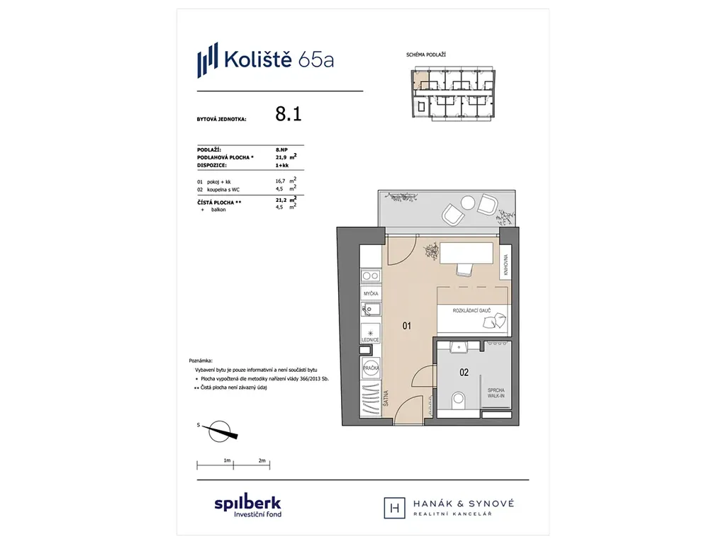 K dlouhodobému pronájmu Vám nabízíme zcela nový, krásný, světlý, moderní byt 1+kk v osobním vlastnictví v novostavbě bytového domu na ulici Koliště, Brno. Byt o ploše 21,9m2 je umístěn ve 8.NP cihlového domu s výtahem a je orientován do klidného vnitrobloku a náleží k němu balkón o ploše 5,1 m2.
