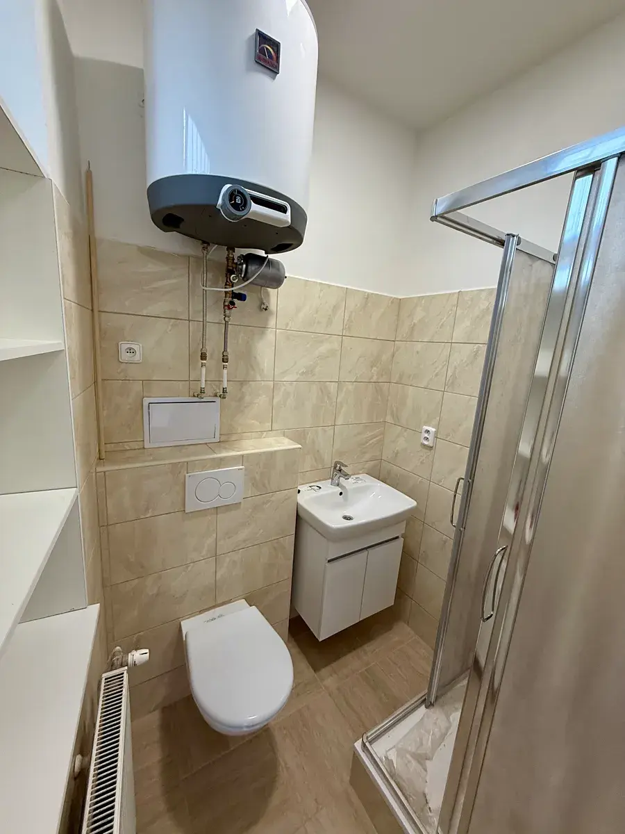 Při vstupu do bytu je vstupní místnost s kuchyňskou linkou s pračkou, lednicí, el. indukční deskou a mikrovlnnou troubou, světlý obytný pokoj není zařízen. V koupelně se nachází sprchový kout s WC.