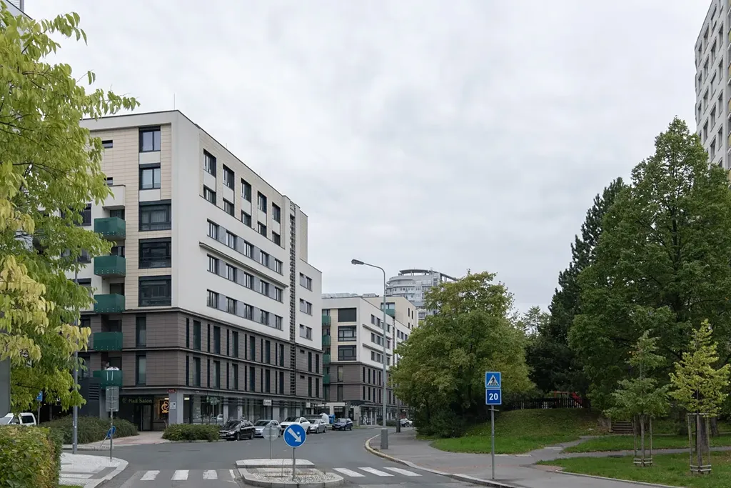 v okolí bytové domy, restaurace, kavárny, obchody i kanceláře