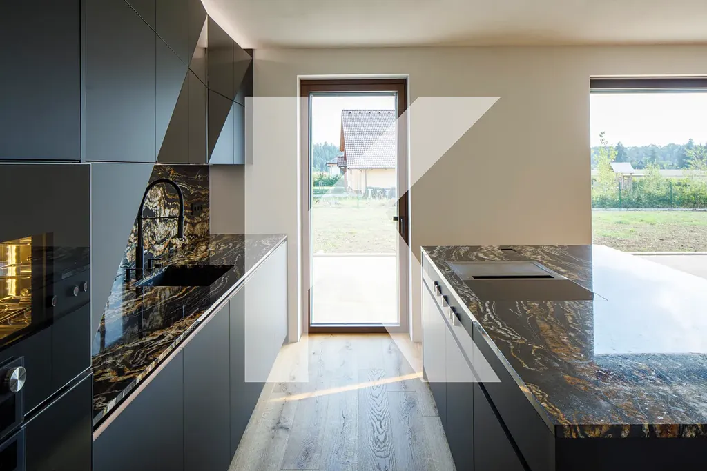 • designová kuchyňská linka se žulovou pracovní deskou, jídelním stolem z masivního dřeva a vestavěnými spotřebiči BORA a Miele, včetně: