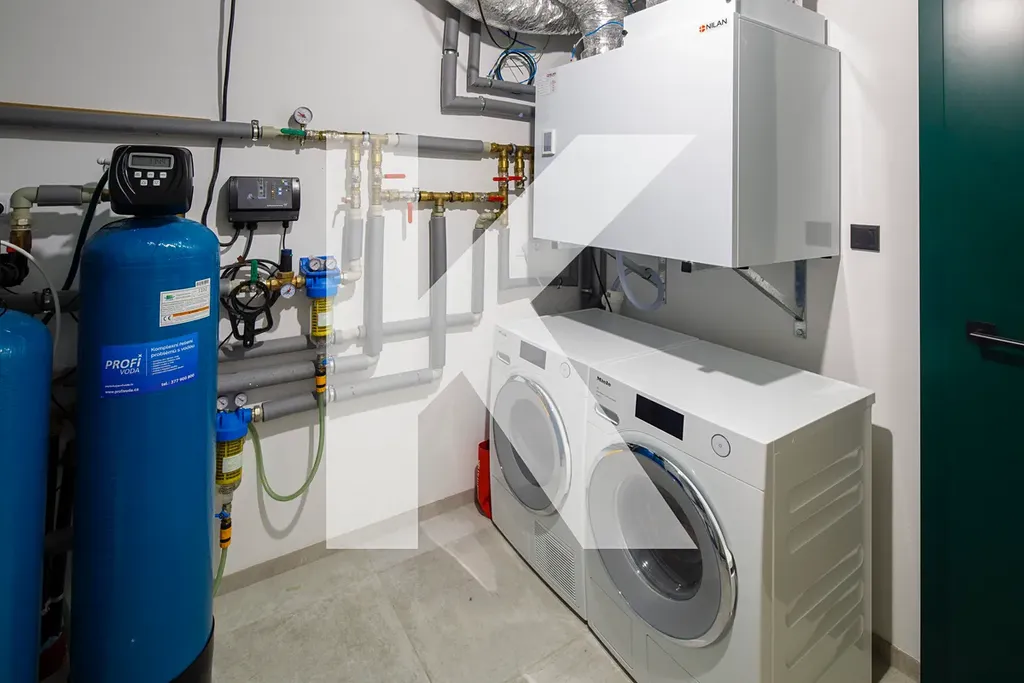 • pasivní standard domu – rekuperační jednotka, tepelné čerpadlo země–voda, izolační trojskla a venkovní stínicí rolety