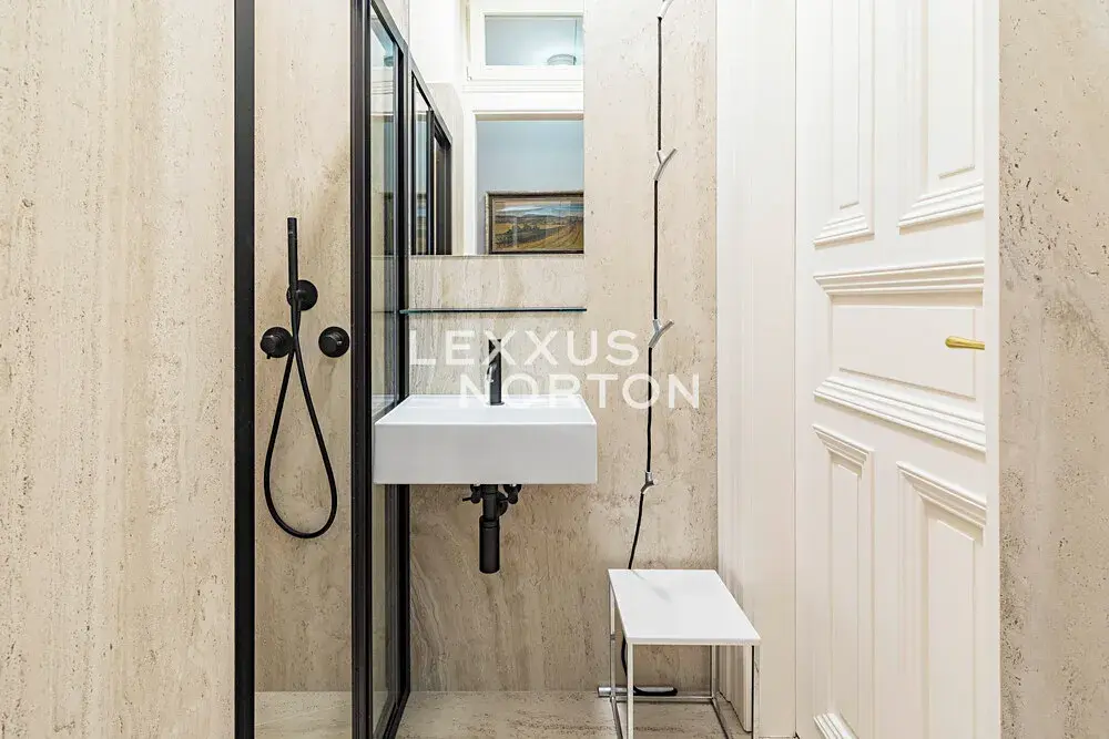 Byt je plně zařízený a vybavený kuchyňským koutem se všemi spotřebiči, včetně pračky, myčky nádobí, lednice s mrazákem, trouby, sporáku a mikrovlnné trouby. K dispozici jsou dvě koupelny - en-suite koupelna nabízí vanu, dvojité umyvadlo, sprchový kout, toaletu a bidet, druhá koupelna je vybavena sprchovým koutem a toaletou. Součástí vybavení bytu je také klimatizace. Podlahy tvoří kombinace nových parket, terazza a dlažby.
