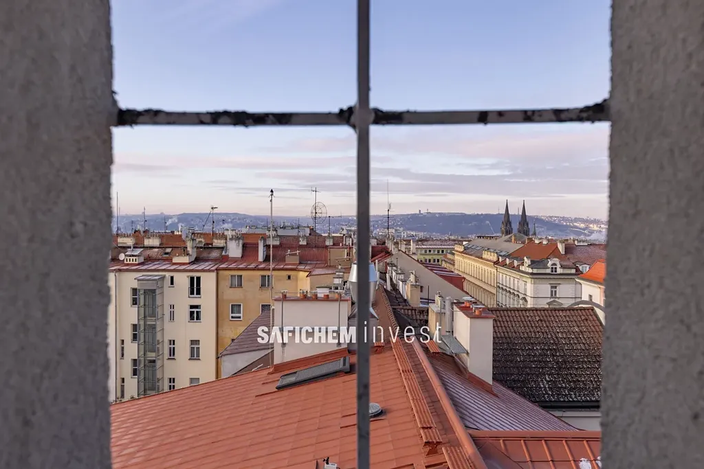 Po schodišti se dostanete do horního patra, kde je umístěn prostorný pokoj se střešními a menšími okny s krásným výhledem na Prahu. Tento prostor nabízí dostatek denního světla i soukromí a může sloužit jako ložnice, dětský pokoj či pracovna.