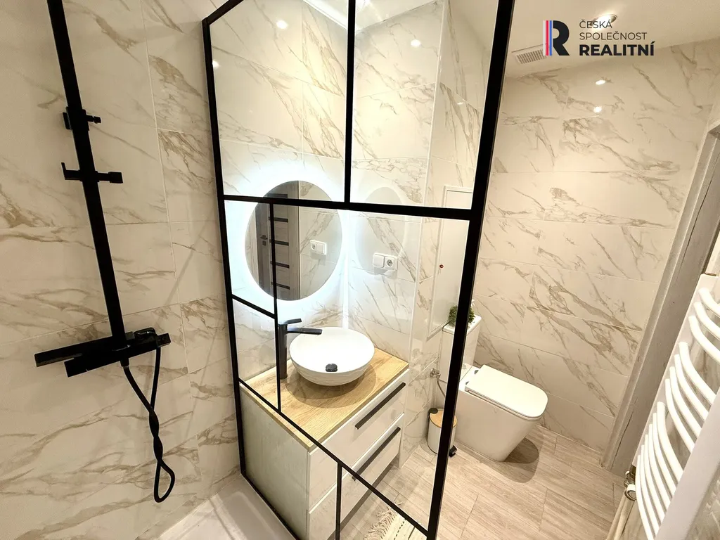 Elegantní koupelna disponuje sprchovým koutem, kvalitní sanitou a moderním umyvadlem, toaleta je součástí koupelny. Nechybí ani praktická předsíň s dostatkem úložného prostoru.