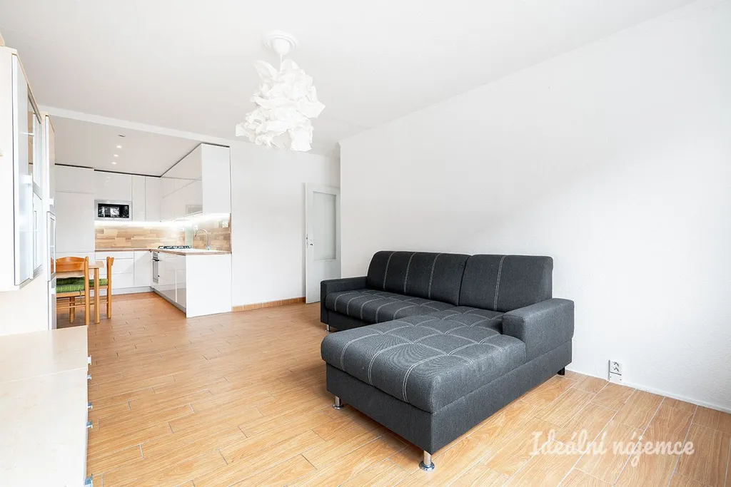 Interiér je nabízen jako částečně vybavený, což budoucím nájemníkům umožňuje doladit si domov podle vlastního vkusu a potřeb. Srdcem bytu je obývací část s pohodlnou sedací soupravou a úložnými prostory, na kterou navazuje plně vybavený kuchyňský kout. V něm najdete lednici s mrazákem, elektrickou i mikrovlnnou troubu, sporák, digestoř a nechybí ani jídelní kout. Součástí bytu jsou dále dva samostatné pokoje, které nabízejí variabilní využití jako ložnice, dětský pokoj nebo klidná pracovna. Koupelna disponuje sprchovým koutem, umyvadlem, pračkou a toaletou.