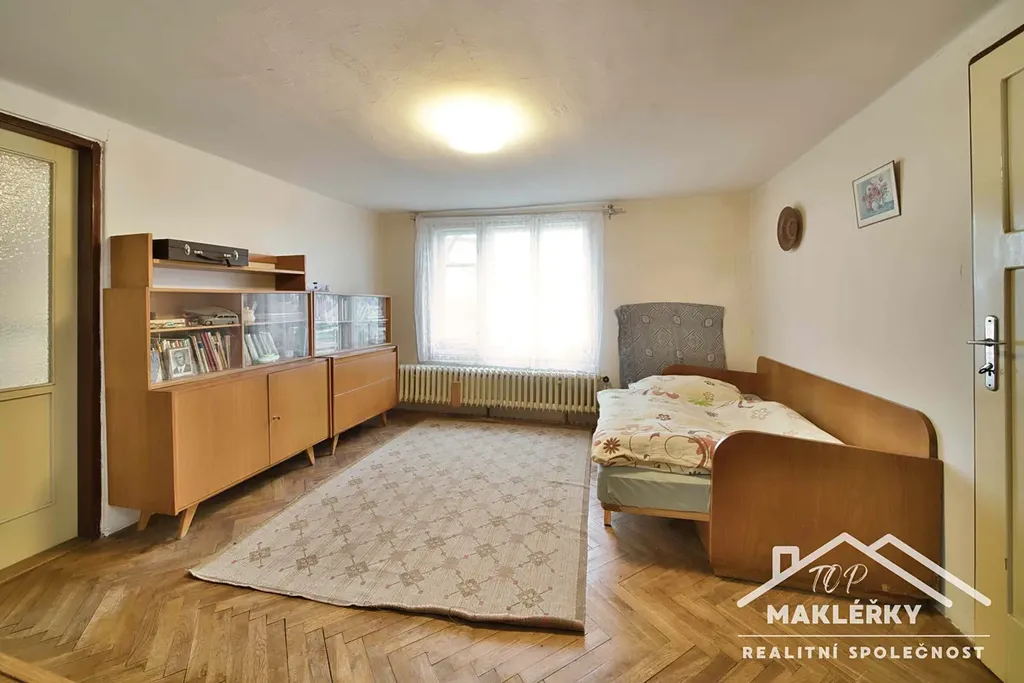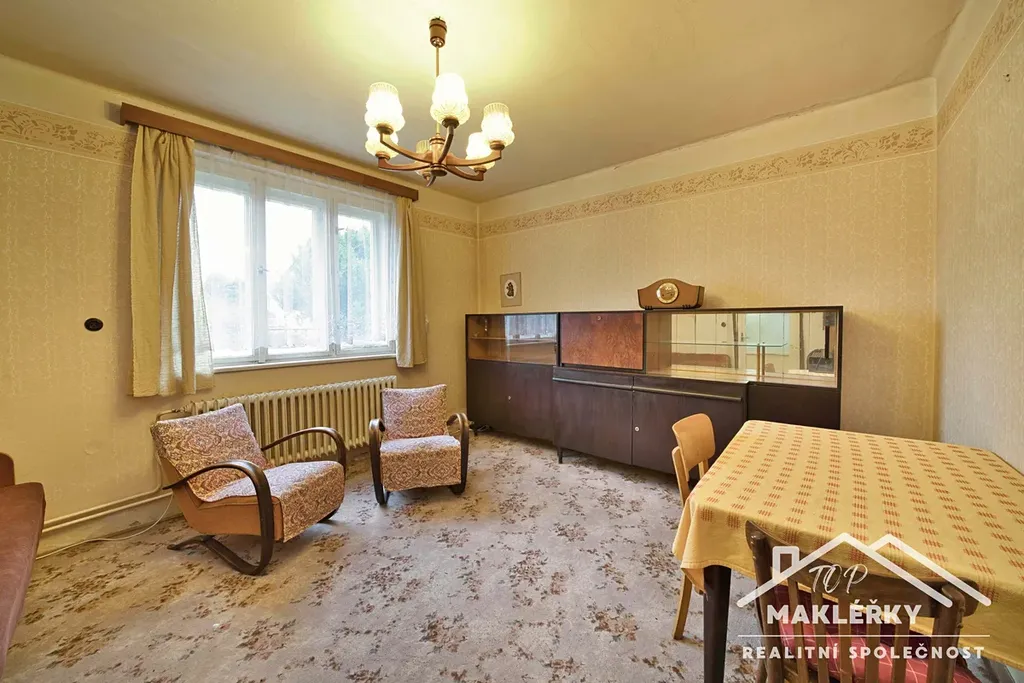 Vážení a milí, nabízím ve výhradním zastoupení k prodeji nemovitost, rodinný dům, ležící v okrajové části obce Veltruby u Kolína. Jedná se o patrovou, částečně podsklepenou stavbu s přístavkem, postavený v druhé polovině 50.let 20. století. Dům je v původním stavu, užívaný, k rekonstrukci. Fasáda břizolit, či podobný materiál. Interier je zachovalý, k okamžitému bydlení, v současné době fungující, majitelé bydlící, je ale potřeba přihlédnout ke stavu např. dřevěných podlah v některé místnosti, pod kterými není beton, ale stále písčitý zásyp. Okna jsou původní, špaletová, zakytovaná. Zařízení, které bude předmětem prodeje je částečné, majitelé si část odvezou. Sklep je prostor pod částí budovy a další sklep je pod přístavbou. Tam je i garáž, pokoj a skladový prostor pod sedlovou střechou.