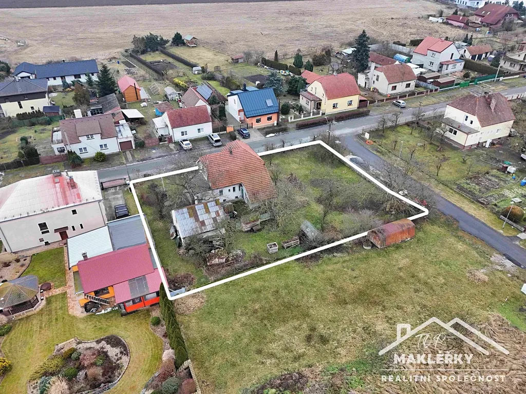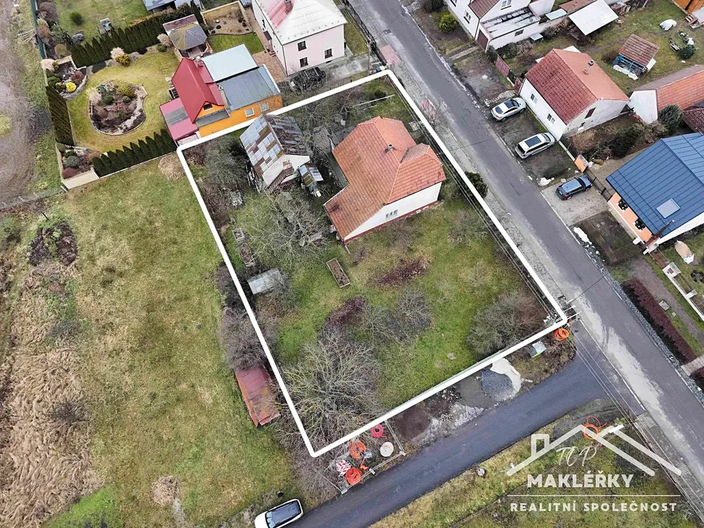 Plot kolem pozemku je kovový, s betonovou podezdívkou. U domu je předzahrádka, propojena kovovými dvířky s velkou zahradou. Tam rostou ovocné stromy a prostor lze využít variabilně. V zadní části domu je i prodlouženou střechou zbudovaný přístřešek s dveřmi, využívaný jako kůlna. Co se týká přípojek- elektřina je původní v hliníku, k domu přivedena vzduchem, sloup je na hranici pozemku. Obec se připravuje k zapravení do země během 2 let. Kanalizace je přivedena cca 10 let. Plyn není. Voda je čerpána ze studny, umístěné v přední části pozemku a druhá studna je za domem, cca 15 let nevyužívaná. Čerpala se z ní užitková voda. Obecní voda je přivedena k pozemku do vybudované šachty a je zaslepená. Lze využít.