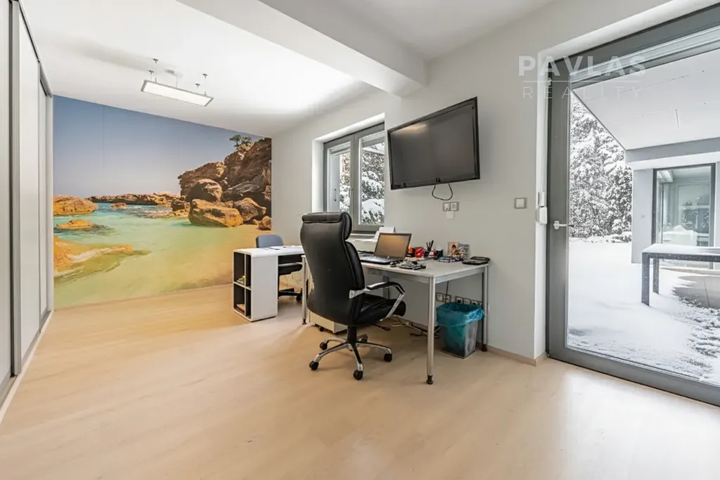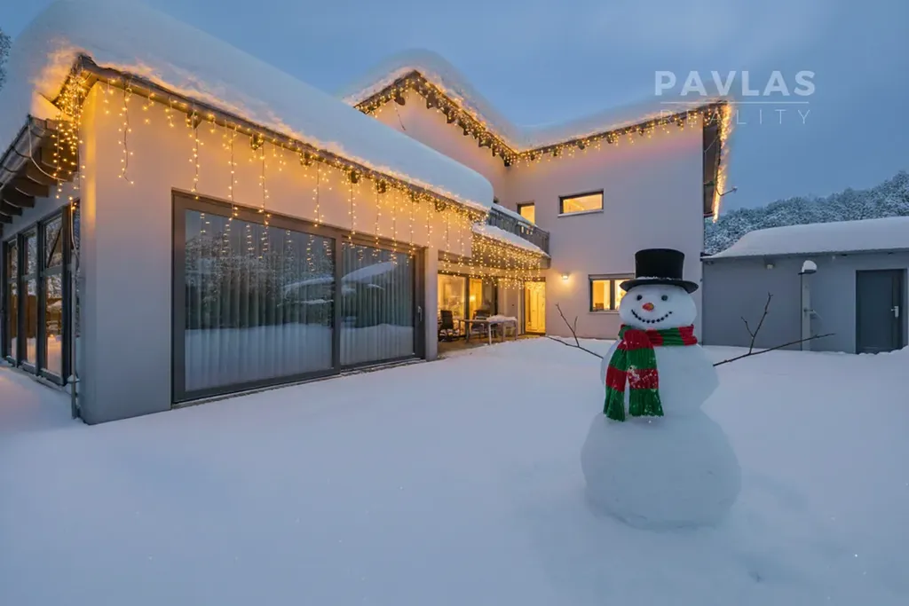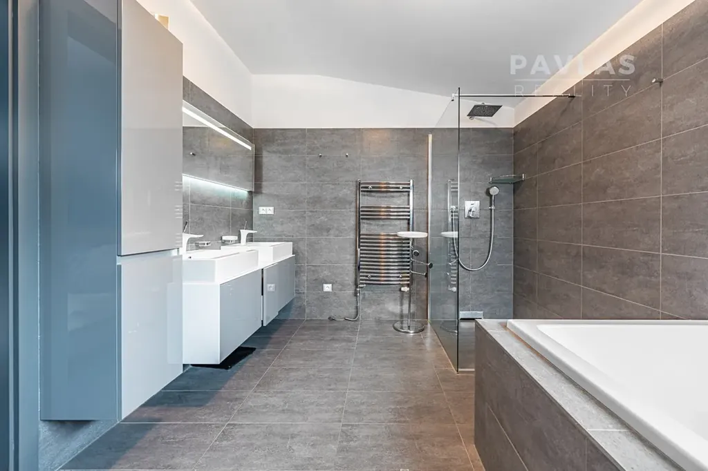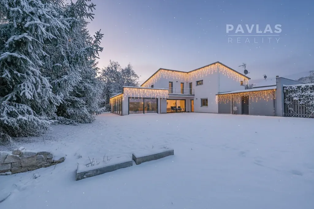 Dominantou celého domu je velkorysý obývací pokoj volně navazující na kuchyni; srdce domova, ideální pro rodinnou pohodu i setkávání s přáteli. K tomu pět prostorných samostatných ložnic, tři elegantní koupelny a dvě rozlehlé terasy, které nabízejí prostor pro ranní kávu i večerní relax pod širým nebem. Celý spodní trakt domu je vybaven velkými portálovými okny, díky kterým je každý kout příjemně prosvětlen denním světlem a interiér plynule propojen se zahradou i terasami.