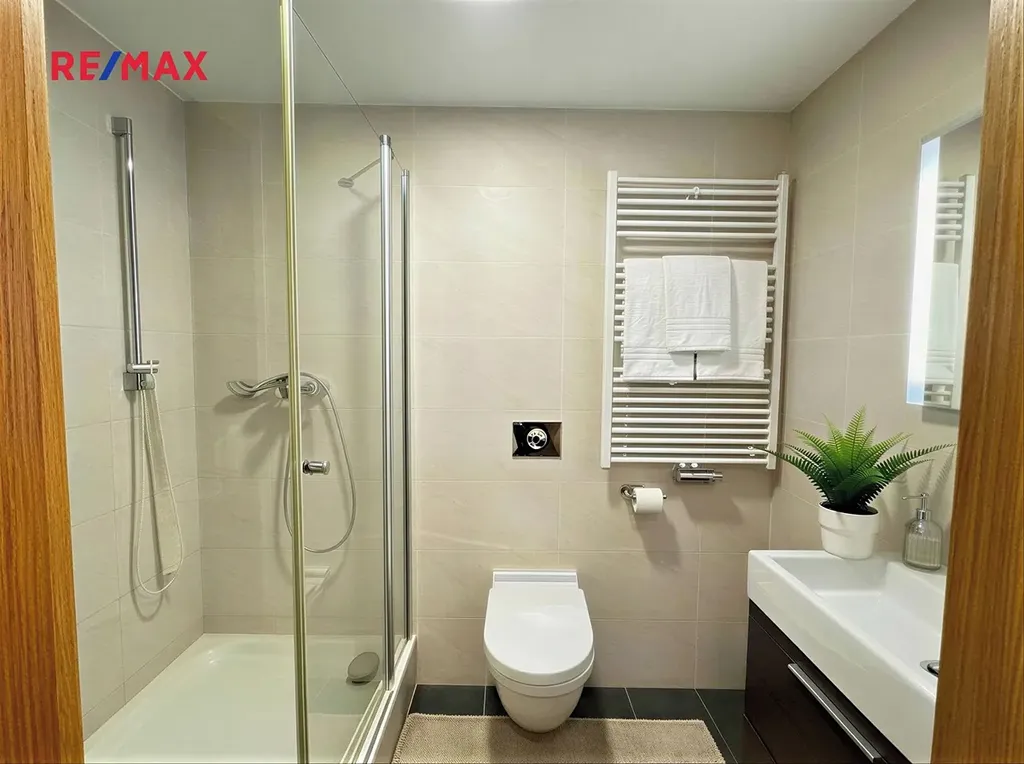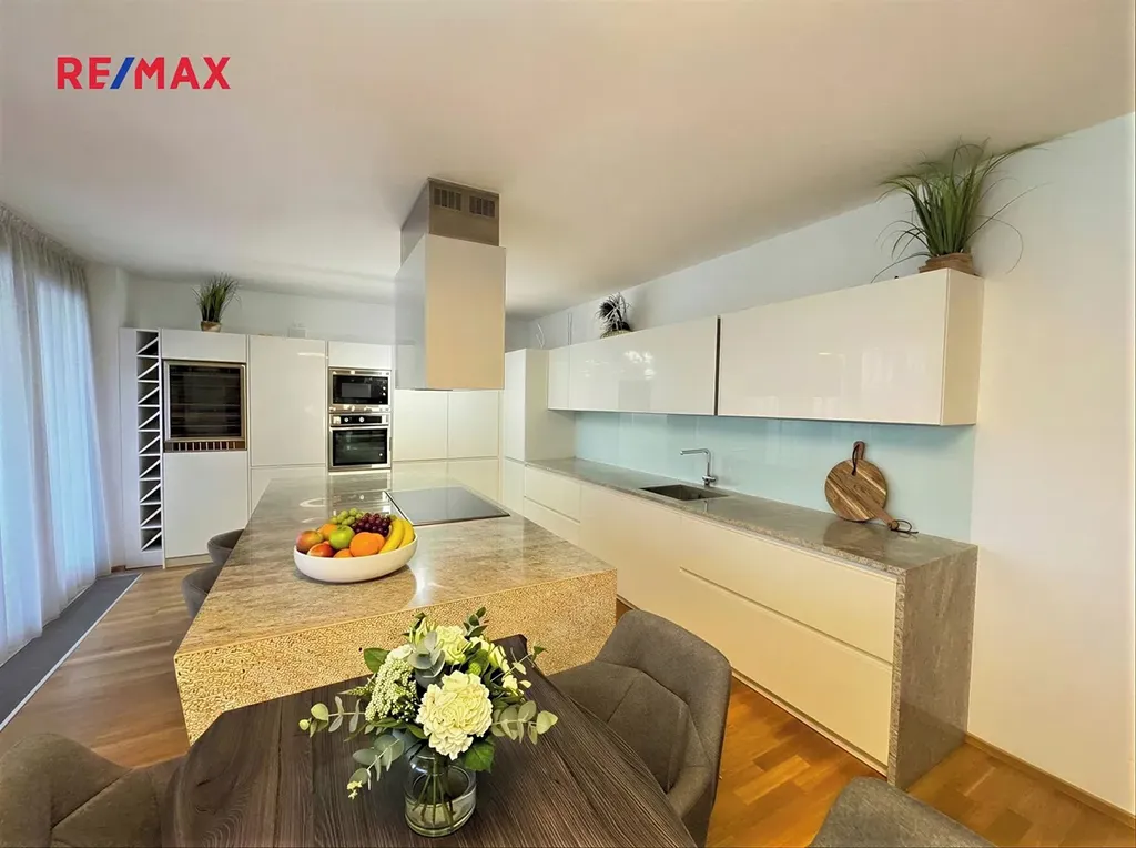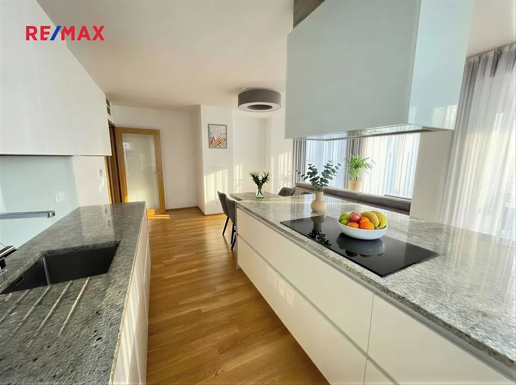 Interiér je proveden ve vysokém standardu – dřevěné podlahy, kvalitní materiály, klimatizace v obytné části a nadčasový design. Byt je plně vybaven a připraven k okamžitému komfortnímu užívání, ideální pro náročné klienty, rodiny či top management.