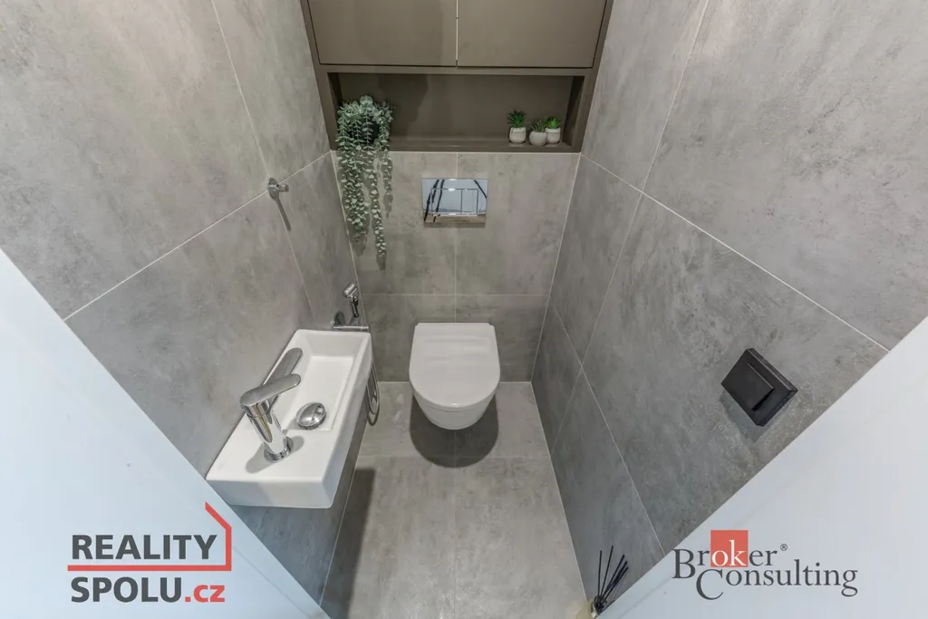 Dům má dvě koupelny – v přízemí se nachází koupelna se sprchovým koutem, toaletou a umyvadlem, v patře pak koupelna se sprchovým koutem, vanou a umyvadlem. Toaleta je řešena samostatně. Koupelny jsou v moderním stylu s kvalitní sanitou, samozřejmostí jsou vestavěné skříně a praktické úložné prostory.