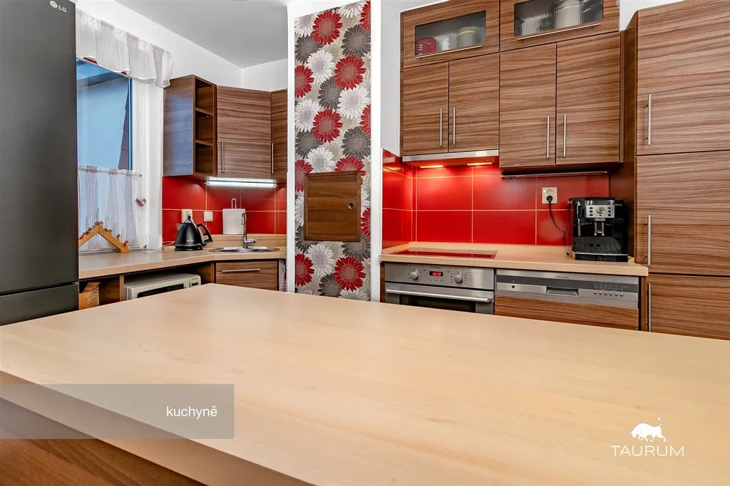 Interiér bytu je částečně zařízen. V ceně bytu je kuchyňská linka s myčkou (60 cm), digestoří s odtahem a elektrickou varnou deskou, vestavěné skříně a skříň v jídelně.