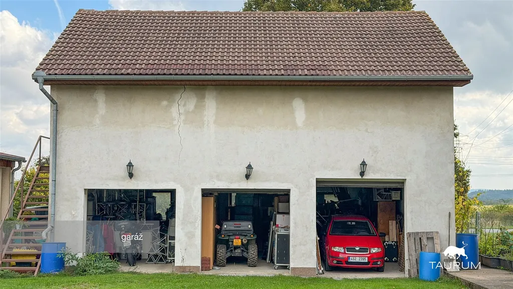 Vedle domu stojí stavba se 3 garážemi s elektrickými vraty a podkrovním prostorem. Tato budova ovšem vykazuje známky poškození. Je tedy možné ji buď opravit a zvětšit, nebo zdemolovat a místo ní postavit novou budovu (sklad, kanceláře, garáže...). STAVEBNÍ POVOLENÍ JE VYDANÉ na budovu o rozměru 11x24 m a do budovy jsou přivedeny přípojky (voda, elektřina, odpad a trubka pro připojení plynu). Současný majitel měl v plánu tuto budovu přestavět na velkou skladovací halu.