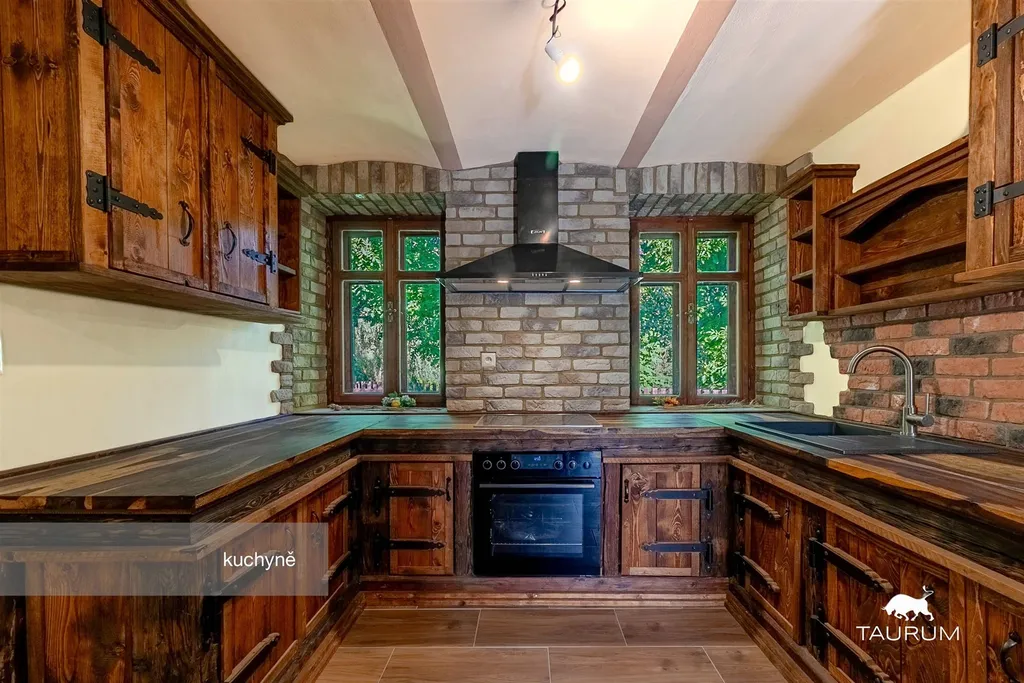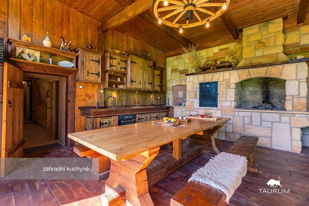 Hlavní obytná budova je dvoupodlažní, nepodsklepená. V přízemí je 5 pokojů, 1 technická místnost, kuchyně, koupelna a krásná stylová zahradní kuchyně s linkou z masivu, udírnou a s krbem s otevřeným ohništěm.