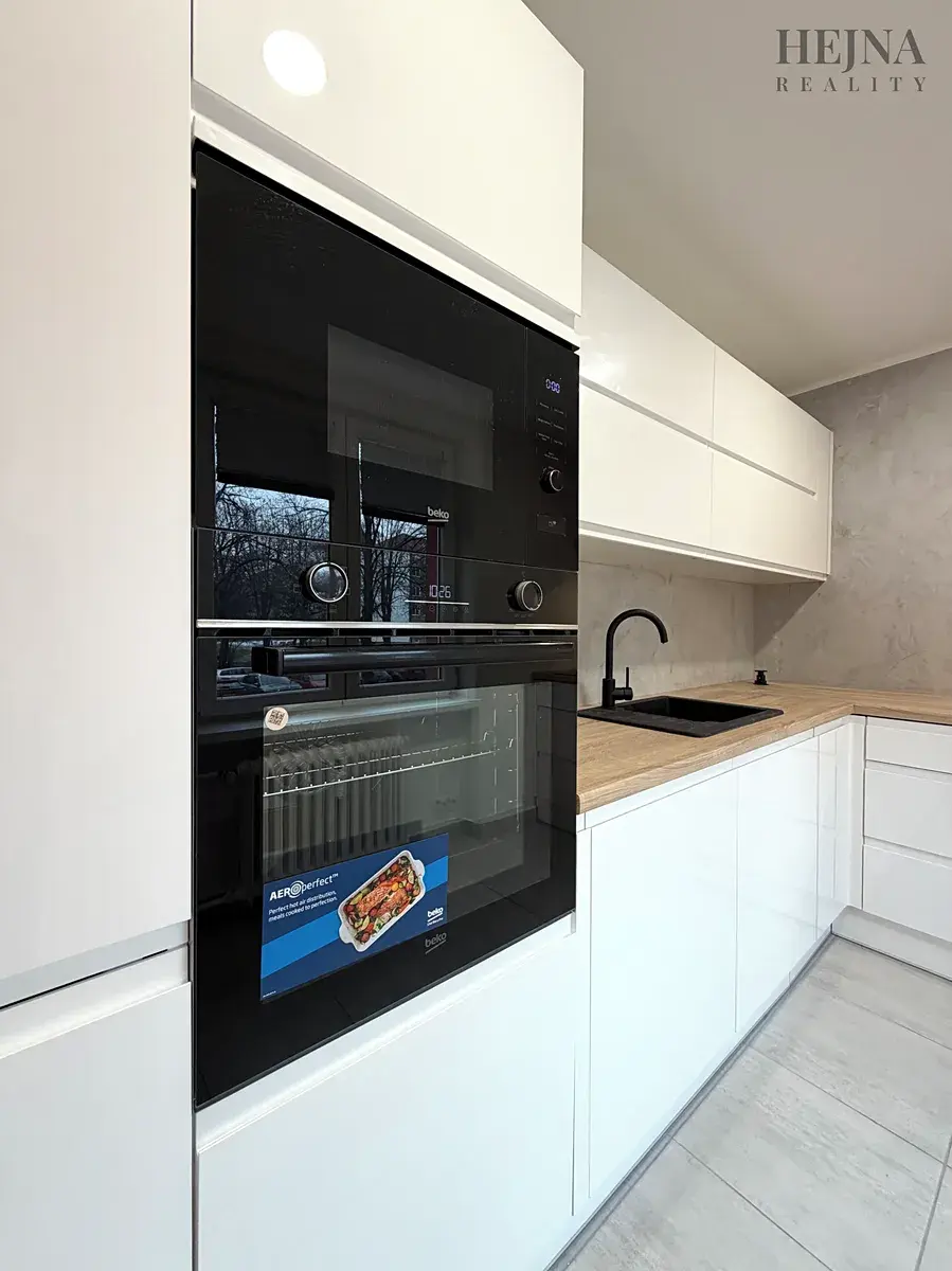 Dominantou bytu je rohová kuchyňská linka na míru plně vybavena spotřebiči - vestavná mikrovlnná trouba, horkovzdušná trouba, lednice, sklokeramická varná deska a digestoř. Kuchyň je propojena s obývací části, otevřený a příjemný prostor orientovaný na západ je krásně prosvětlený, zejména v odpoledních hodinách. Koupelna je prostorná, vybavená vanou se zástěnou ke sprchování a pračkou. WC je odděleno. V chodbě se nachází vestavěné skříně na míru s dostatkem úložného prostoru. Ložnice je orientovaná na východ a nabízí klidný výhled do vnitrobloku, ideální pro nerušený odpočinek.
