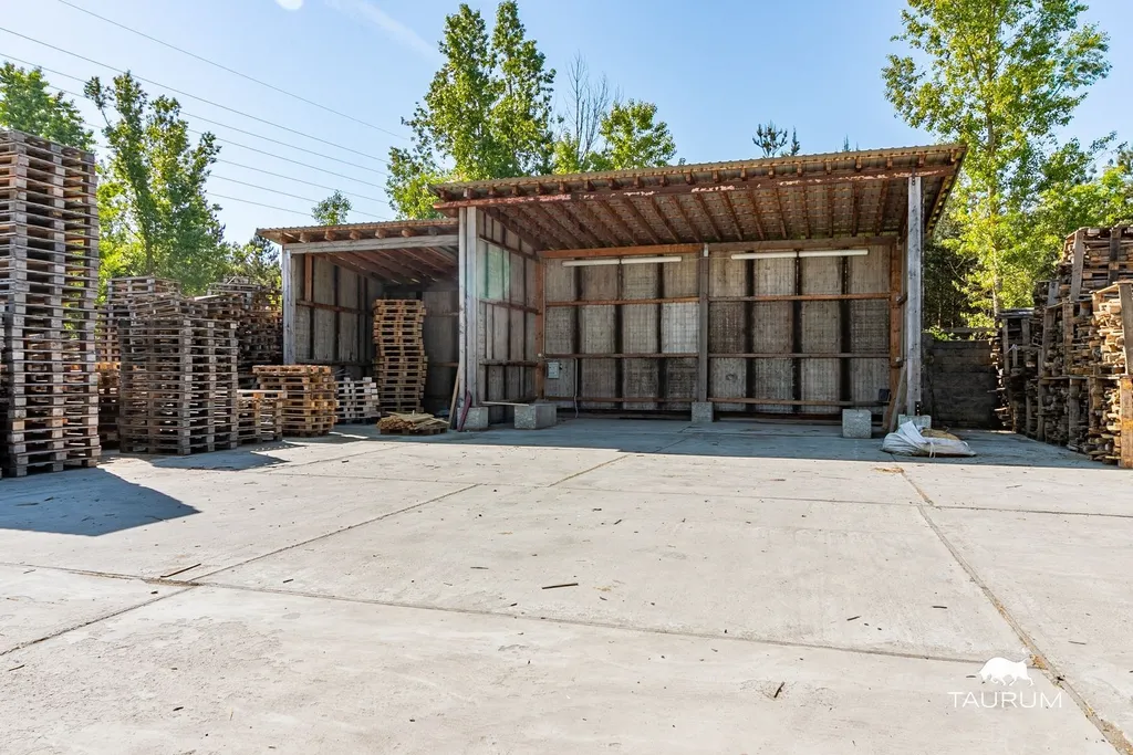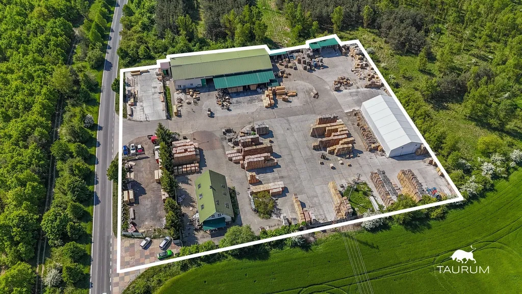 Dále jsou na pozemku přístřešky tmavě zelené plochy na fotce z dronu. Před vjezdem do hlavního pozemku jsou na levé i pravé straně samostatné oplocené pozemky.