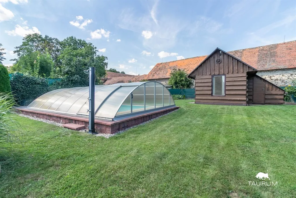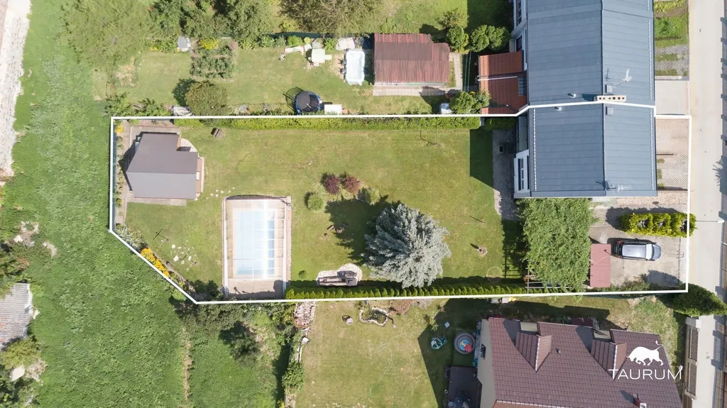 Z kuchyně nebo i přímo z prostoru pro parkovací místa jsou přístupy na krásnou, velkou, rovinatou a udržovanou zahradu, kde je možné posezení jak pod pergolou s krbem, tak na lavičce pod vzrostlým jehličnanem. Najdete tam též plně funkční bazén a zahradní domek, který je rozdělen na obytnou a užitnou část.