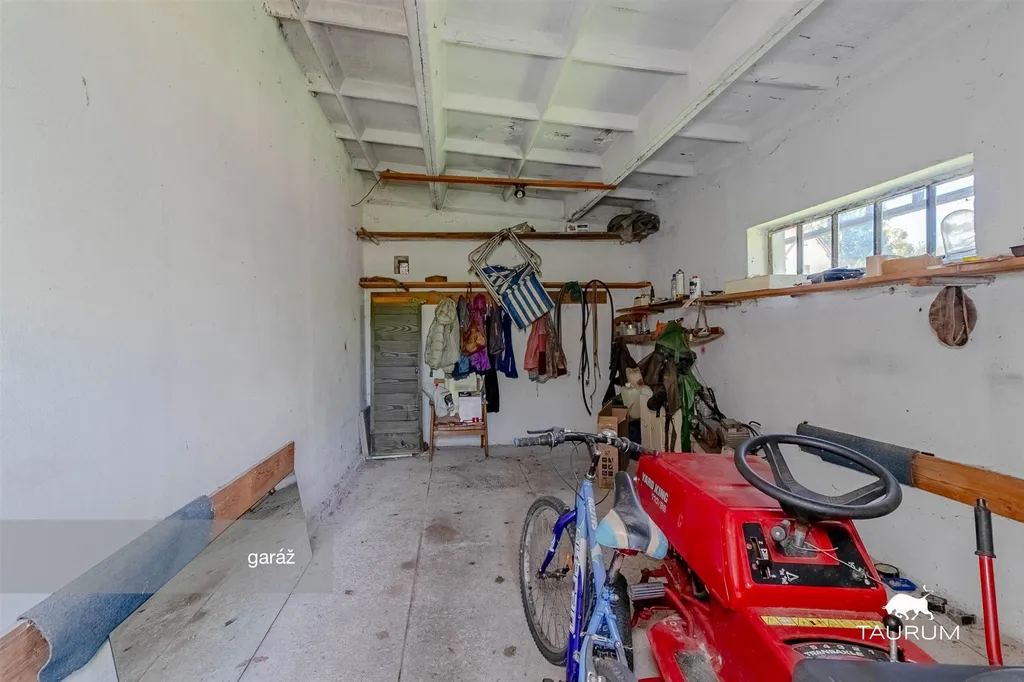 Na dům navazuje garáž a na zahradě jsou další dřevěné zahradní stavby sloužící jako dílna a místo pro uskladnění zahradního nářadí.