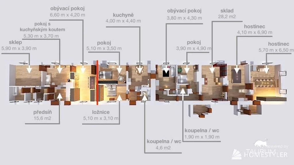 Užitná plocha (byty + hostinec): 280 m2