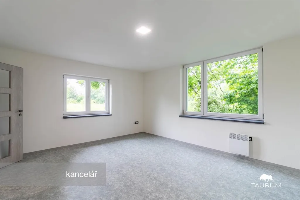 V domě jsou 2 prostorné přibližně čtvercové místnosti, využitelné jako kanceláře, nebo provozní místnosti. V předsíňce je menší kuchyňská skříňka s dřezem. Za předsíní uprostřed domu je koupelna s wc a velkým sprchovým koutem. Celková užitná plocha domu je 50 m2.