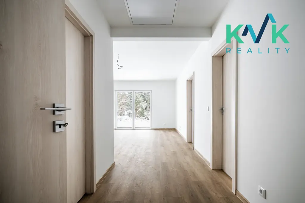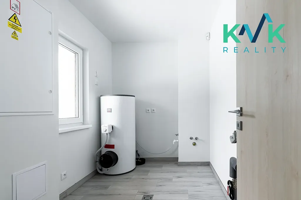 Dům 4kk s užitnou plochou 160 m2 je řešen prakticky, vybaven kvalitními materiály a moderními technologiemi. Splňuje nároky na energetickou úspornost s certifikací A. Dispozice této nemovitosti je řešená velmi intuitivně. Z předsíně se po pravé straně nachází technická místnost, kde je srdce domu se zabudovanou fotovoltarikou jako zdroj tepla a také bojler. Vedle se nachází spíž pro uložení potravin. Naproti je první pokoj, který sousedí s koupenou. Dále po pravé straně poskytuje pohodlí s výhledem do zahrady druhý pokoj. Společenská místnost s krbovými kamny (výkon 12-14 kW), klimatizací a prostorem pro kuchyňskou linku je situovaná na jižní stranu. Celý tento prostor má dva vstupy na zahradu. Podlahy ve společenské místnosti jsou pokryté vinylem o tloušťce 1 cm, v ložnicích se projdeme po laminátu o tloušťce 1 cm a v technických místnostech se nachází dlažba. V celém domě je položeno pro podlahové topení (folie a kabel) a zabudované termostaty ovládané přes Wi-Fi, jenž zajišťuje příjemné teplo v každém ročním období. Topení je doplněno klimatizací, která nabízí jak chlazení, tak vytápění, což přispívá k maximálnímu komfortu bydlení.