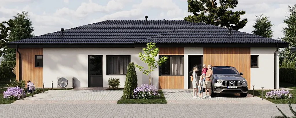 Standardem je tepelné čerpadlo Panasonic,podlahové vytápění,okna s trojskly,italské obklady,příprava na fotovoltaiku a parkování pro dva vozy přímo u domu.