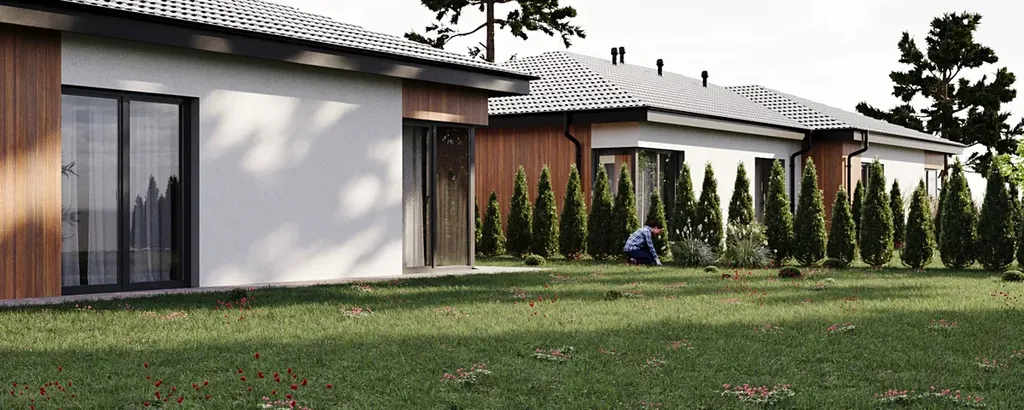 Dům je součástí developerského projektu jednopodlažních nízkoenergetických (PENB A)zděných dvojdomů Domy Dolany a nabízí komfortní, úsporné bydlení s vlastním pozemkem v příjemném a klidném prostředí.